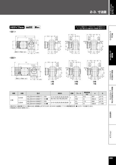 インダクションギアモータ2-3.寸法図オプション技術資料F2/F3タイプ同心中空軸・同心中実軸F/FAタイプ中空軸・中実軸H/H2タイプ直交軸G/G3タイプ平行軸H2タイプ直交軸軸径22脚取付カッコ()の値はブレーキ付ギアモータの表示です。カッコ[]の値は出力軸材質炭素鋼の表示です。<図1>B(A)A24.530.56150108.2904032[35]φ22h6φ22h61051210512108.2904032[35]58108.2904032[35]904032[35]φ22h6φ22h610512適合コード径φ8~φ12701064-φ1190116454590116459011645<図2>B(A)A24.530.56150108.2904032[35]φ22h6φ22h61051210512108.2904032[35]58108.2904032[35]904032[35]φ22h6φ22h610512適合コード径φ8~φ12701064-φ1190116H軸L軸454590116M軸R軸454590116B軸T軸相数容量型式減速比図番ブレーキ三相0.1kW0.2kWH2L22#***-WM01T◇◇ENH2L22#***-WM01T◇◇EV◆H2L22#***-WM02T◇◇ENH2L22#***-WM02T◇◇EV◆5,10,15,20,25,30,40,50,60,80,100,120,160,200,2405,10,15,20,25,30,40,50,6012なし付きなし付き概略質量(kg)6.587.59A267294.5282338.5Bφ115φ115φ115□126※型式の#には軸材質ステンレス鋼はH,M,B、炭素鋼はL,R,Tが入ります。また***には減速比、◇◇には電源電圧記号、◆にはブレーキ仕様が入ります。※性能表はP.264をご参照ください。269