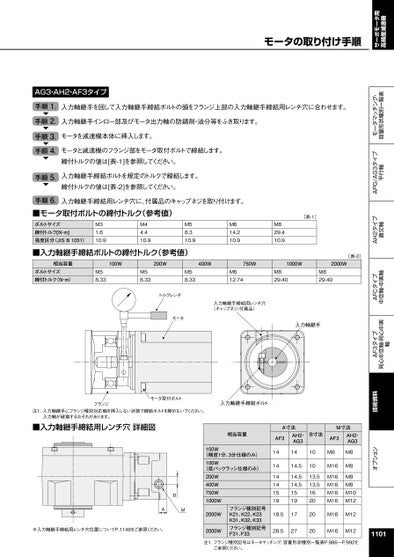 サーボモータ用高精度減速機オプション技術資料AF3タイプ同心中空軸・同心中実軸AFCタイプ中空軸・中実軸AH2タイプ直交軸APG/AG3タイプ平行軸モータマッチング・容量形状種別一覧表AG3・AH2・AF3タイプ手順1.手順2.手順3.手順4.入力軸継手を回して入力軸継手締結ボルトの頭をフランジ上部の入力軸継手締結用レンチ穴に合わせます。入力軸継手インロー部及びモータ出力軸の防錆剤・油分等をふき取ります。モータを減速機本体に挿入します。モータと減速機のフランジ部をモータ取付ボルトで締結します。締付トルクの値は[表-1]を参照してください。手順5.入力軸継手締結ボルトを規定のトルクで締結します。締付トルクの値は[表-2]を参照してください。入力軸継手締結用レンチ穴に、付属品のキャップネジを取り付けます。手順6.■モータ取付ボルトの締付トルク(参考値)ボルトサイズ締付トルク[N・m]強度区分(JISB1051)M31.610.9M44.410.9M58.310.9M614.210.9M829.410.9■入力軸継手締結ボルトの締付トルク(参考値)[表-1][表-2]相当容量ボルトサイズ締付トルク(N・m)100W200W400W750W1000W2000WM58.33M58.33M58.33M612.74M829.40M829.40トルクレンチモータ入力軸継手締結用レンチ穴(キャップネジ-付属品)入力軸継手フランジモータ取付ボルト入力軸継手締結ボルト注1.入力軸継手にフランジ種別対応軸を挿入しない状態で締結ボルトを締めないでください。入力軸が破損するおそれがあります。■入力軸継手締結用レンチ穴詳細図相当容量100W(精度1分、3分仕様のみ)100W(低バックラッシ仕様のみ)BAM※入力軸継手締結用レンチ穴位置についてP.1148をご参照ください。200W400W750W1000W2000W2000WA寸法AF3AH2・AG3B寸法M寸法AF3AH2・AG31414141415191414.514.514.51519101013.513.516202020M8M16M16M16M16M16M8M8M8M8M10M12M16M12M16M121101フランジ種別記号K21、K22、K23K31、K32、K33フランジ種別記号F31、F3318.51728.527注1.フランジ種別記号はモータマッチング、容量形状種別一覧表P.986~P.992をご参照ください。