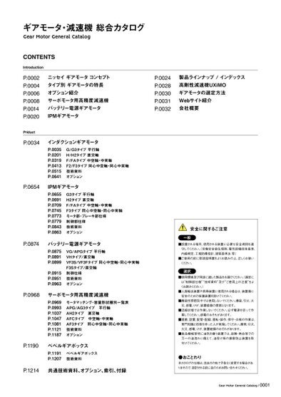 ギアモータ・減速機総合カタログGearMotorGeneralCatalogCONTENTSIntroductionP.0002P.0004P.0006P.0008P.0014P.0020PriductP.0034P.0654P.0874P.0968ニッセイギアモータコンセプトタイプ別ギアモータの特長オプション紹介サーボモータ用高精度減速機バッテリー電源ギアモータIPMギアモータインダクションギアモータP.0035G/G3タイプ平行軸P.0201H/H2タイプ直交軸P.0319F/FAタイプ中空軸・中実軸P.0413F2/F3タイプ同心中空軸・同心中実軸P.0515技術資料P.0641オプションIPMギアモータP.0655P.0691P.0709P.0745P.0773P.0779P.0843P.0863G3タイプ平行軸H2タイプ直交軸F/FAタイプ中空軸・中実軸F3タイプ同心中空軸・同心中実軸モータ部・ブレーキ部仕様制御部仕様技術資料オプションバッテリー電源ギアモータP.0875P.0891P.0899VG/APGタイプ平行軸VHタイプ/直交軸VF3S/VF3Fタイプ同心中空軸・同心中実軸F3Sタイプ/直交軸制御仕様技術資料オプションP.0915P.0951P.0963サーボモータ用高精度減速機P.0969P.0993P.1037P.1047P.1081P.1121P.1187モータマッチング・容量形状種別一覧表APG/AG3タイプ平行軸AH2タイプ直交軸AFCタイプ中空軸・中実軸AF3タイプ同心中空軸・同心中実軸技術資料オプションP.1190べべルギアボックスP.1191P.1207ベベルギアボックス技術資料P.1214共通技術資料、オプション、索引、付録P.0024P.0028P.0030P.0031P.0032製品ラインナップ/インデックス高剛性減速機UXiMOギアモータの選定方法Webサイト紹介会社概要安全に関するご注意一般■設置される場所、使用される装置に必要な安全規則を遵守してください。労働安全衛生規則、電気設備技術基準、内線規定、工場防爆指針、建築基準法等)■ご使用の前に取扱説明書をよくお読みの上、正しくお使いください。選択■使用環境及び用途に適した製品をお選びください。選定に“制御部仕様”技術資料”及び“ご使用上の注意”をよはくお読みください。)■人員輸送装置や昇降装置に使用される場合は、装置側に安全のための保護装置を設けてください。■爆発性雰囲気中では使用しないでください。爆発、引火、火災、感電、けが、装置破損の原因となります。■活線状態では作業しないでください。必ず電源を切って作業してください。感電のおそれがあります。■運搬、設置、配管・配線、運転・操作、保守・点検の作業は、専門知識と技能を持った人が実施してください。爆発、引火、火災、感電、けが、装置破損のおそれがあります。■食品機械等特に油気を嫌う装置では、故障・寿命等での万一の油洩れに備えて、油受け等の損害防止装置を取付けてください。●おことわり本カタログの仕様は、改良その他で予告なく変更する場合がありますので、設計される前に念のためお問い合わせください。GearMotorGeneralCatalog/0001