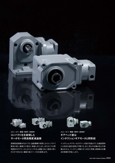 容量:100W~3000WAPG/AFCコンパクト化を実現したサーボモータ用高精度減速機容量:100W~2000WAH2/AF3ギアヘッド部はインダクションギアモータと同形状高精度減速機APGタイプは、遊星機構の採用によりコンパクトで剛性が高く、機器の小型化に貢献します。また、AFCタイプは専用設計のギアケースによりコンパクト化。装置に対して直角に取り付けができるため、機器の省スペース化を実現します。インダクションギアモータとギアヘッド部が共通なので、仕様変更時には余計な設計変更は不要です。また、同心中空軸/同心中実軸(AF3)は、バックラッシ精度1分・3分をご用意。高精度な位置決め制御を可能にします。GearMotorGeneralCatalog/0009