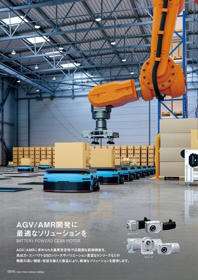 AGV/AMR開発に最適なソリューションをBATTERYPOWERDGEARMOTORSDシリーズAGV/AMRに求められる速度安定性や広範囲な制御機能を、高出力・コンパクトなSDシリーズやバリエーション豊富なVシリーズなどの精度の高い機能・性能を備えた製品により、最適なソリューションを提供します。Vシリーズ0016/GearMotorGeneralCatalog