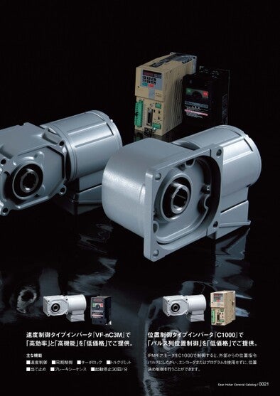 速度制御タイプインバータ『VF-nC3M』で位置制御タイプインバータ『C1000』で「高効率」と「高機能」を「低価格」でご提供。「パルス列位置制御」を「低価格」でご提供。主な機能■速度制御■同期制御■サーボロック■トルクリミット■当て止め■ブレーキシーケンス■起動停止30回/分IPMギアモータをC1000で制御すると、外部からの位置指令パルスにしたがい、エンコーダまたはプログラムを使用せずに、位置決め制御を行うことができます。GearMotorGeneralCatalog/0021