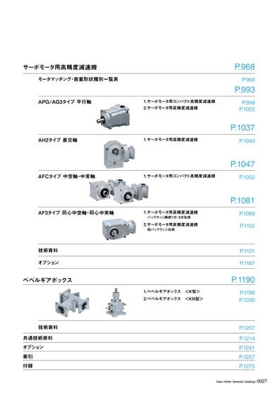 サーボモータ用高精度減速機モータマッチング・容量形状種別一覧表APG/AG3タイプ平行軸1.サーボモータ用コンパクト高精度減速機2.サーボモータ用高精度減速機AH2タイプ直交軸1.サーボモータ用高精度減速機AFCタイプ中空軸・中実軸1.サーボモータ用コンパクト高精度減速機バックラッシ精度1分・3分仕様1.サーボモータ用高精度減速機2.サーボモータ用高精度減速機低バックラッシ仕様1.ベベルギアボックス<K型>2.ベベルギアボックス<KN型>AF3タイプ同心中空軸・同心中実軸技術資料オプションベベルギアボックス技術資料共通技術資料オプション索引付録968969993998102210371040104710521081108811021121118711901196120012071214124112571275GearMotorGeneralCatalog/0027