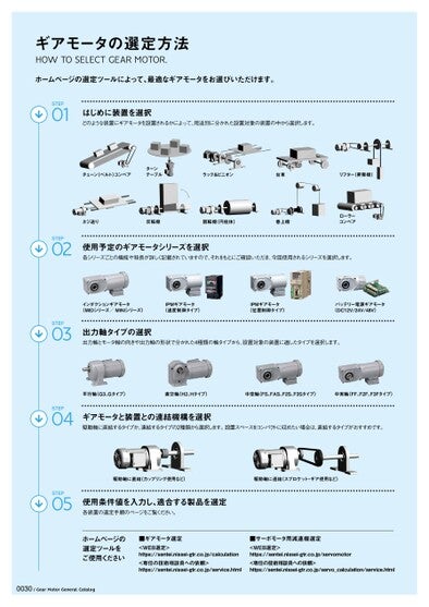 ギアモータの選定方法HOWTOSELECTGEARMOTOR.ホームページの選定ツールによって、最適なギアモータをお選びいただけます。STEP01STEP02STEP03STEP04STEP05はじめに装置を選択どのような装置にギアモータを設置されるかによって、用途別に分かれた設置対象の装置の中から選択します。チェーン(ベルト)コンベアターンテーブルラック&ピニオン台車リフター(昇降機)ネジ送り反転機回転機(円柱体)巻上機ローラーコンベア使用予定のギアモータシリーズを選択各シリーズごとの機能や特長が詳しく記載されていますので、それをもとにご確認いただき、今回使用されるシリーズを選択します。インダクションギアモータ(MIDシリーズ/MINIシリーズ)IPMギアモータ(速度制御タイプ)IPMギアモータ(位置制御タイプ)バッテリー電源ギアモータ(DC12V/24V/48V)出力軸タイプの選択出力軸とモータ軸の向きや出力軸の形状で分かれた4種類の軸タイプから、設置対象の装置に適したタイプを選択します。平行軸(G3、Gタイプ)直交軸(H2、Hタイプ)中空軸(FS、FAS、F2S、F3Sタイプ)中実軸(FF、F2F、F3Fタイプ)ギアモータと装置との連結機構を選択駆動軸に直結するタイプか、連結するタイプの2種類から選択します。設置スペースをコンパクトに収めたい場合は、直結するタイプがおすすめです。駆動軸に直結(カップリング使用など)駆動軸に連結(スプロケット・ギア使用など)使用条件値を入力し、適合する製品を選定各装置の選定手順のページをご覧ください。ホームページの選定ツールをご使用ください■ギアモータ選定<WEB選定>https://sentei.nissei-gtr.co.jp/calculation<専任の技術相談員への依頼>https://sentei.nissei-gtr.co.jp/service.html■サーボモータ用減速機選定<WEB選定>https://sentei.nissei-gtr.co.jp/servomotor<専任の技術相談員への依頼>https://sentei.nissei-gtr.co.jp/servo_calculation/service.html0030/GearMotorGeneralCatalog