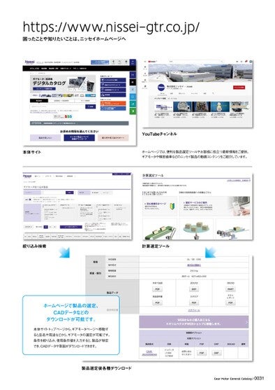 https://www.nissei-gtr.co.jp/困ったことや知りたいことは、ニッセイホームページへYouTubeチャンネル本体サイトホームページでは、便利な製品選定ツールやお客様に役立つ最新情報をご提供。ギアモータや精密歯車などのニッセイ製品の動画コンテンツをご紹介しています。絞り込み検索計算選定ツールホームページで製品の選定、CADデータなどのダウンロードが可能です。本体サイトトップページから、ギアモータページへ移動すると品名や用途などから、ギアモータの選定が可能です。条件を絞り込み、使用条件値を入力すると、製品が特定でき、CADデータや取説がダウンロードできます。製品選定後各種ダウンロードGearMotorGeneralCatalog/0031