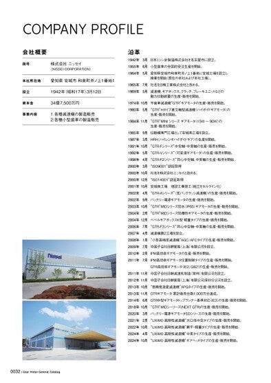 COMPANYPROFILE会社概要商号株式会社ニッセイ(NISSEICORPORATION)本社所在地愛知県安城市和泉町井ノ上1番地1設立資本金事業内容1942年(昭和17年)3月12日34億7,500万円1.各種減速機の製造販売2.各種小型歯車の製造販売沿革1942年3月日本ミシン針製造株式会社を名古屋市に設立。1955年6月小型歯車の全国的受注生産を開始。1964年5月愛知県安城市和泉町井ノ上1番地に安城工場を設立し操業を開始(現在の本社および本社工場)。1965年7月社名を日精工業株式会社と改める。1969年5月減速機、ギアボックス、クラッチ、ブレーキユニットなどの動力伝動装置の生産・販売を開始。1974年10月平歯車減速機“GTR”ギアモータの生産・販売を開始。1980年5月“GTR”Hタイプ直交軸型減速機(ハイポイドギアモータ)の生産・販売を開始。1984年11月“GTR”MINIシリーズギアモータ(15W~90W)の生産・販売を開始。1985年9月伝動機専門工場として安城南工場を設立。1987年3月HRH(ハイレシオハイポイドギア)の生産を開始。1991年10月“GTR-Fシリーズ”中空軸・中実軸の生産・販売を開始。1992年5月“GTR-Vシリーズ”可変速ギアモータ)の生産・販売を開始。1998年4月“GTR-F2シリーズ”同心中空軸、中実軸の生産・販売を開始。2000年3月“ISO9001”認証取得2000年10月社名を株式会社ニッセイと改める。2000年12月“ISO14001”認証取得2001年10月安城南工場増設工事竣工(組立をセルライン化)2002年4月“GTR-Aシリーズ”低バックラッシ減速機)の生産・販売を開始。2002年9月バッテリー電源ギアモータの生産・販売を開始。2003年10月“GTR”MIDシリーズ防水(IP65)ギアモータの生産・販売を開始。2004年2月“GTR”MIDシリーズ防爆形ギアモータの生産・販売を開始。2004年12月ベベルギアボックスK型軽量タイプの生産・販売を開始。2006年7月“GTR-F3シリーズ”同心中空軸・中実軸の生産・販売を開始。2007年4月減速機第2工場を設立。2008年1月“小型高精度減速機”AGC/AFCタイプの生産・販売を開始。2009年7月中国子会社日静貿易(上海)有限公司を設立。2010年2月IPM高効率ギアモータの生産・販売を開始。2011年7月IPM高効率ギアモータ位置制御タイプの生産・販売を開始。GTR高効率ギアモータ(IE2、GB2)の生産・販売を開始。2011年11月中国子会社日静減速机制造(常州)有限公司を設立。2012年11月中国子会社日静貿易(上海)有限公司深圳分公司を設立。2013年10月“高精度遊星減速機”APGタイプの生産・販売を開始。2013年11月GTRギアモータ累計販売台数1,000万台達成。2014年6月GTR中型ギアモータトップランナー基準対応(IE3)の生産・販売を開始。2018年10月“GTR”MIDシーリーズ(NEXTGTR)の生産・販売を開始。2020年3月バッテリー電源ギアモータSDシリーズの生産・販売を開始。2021年2月“UXiMO高剛性減速機”大口径中空タイプの生産・販売を開始。2022年10月“UXiMO高剛性減速機”扁平・軽量タイプの生産・販売を開始。2024年4月“UXiMO高剛性減速機”中実タイプの生産・販売を開始。2024年10月“UXiMO高剛性減速機”ギアヘッドタイプの生産・販売を開始。0032/GearMotorGeneralCatalog