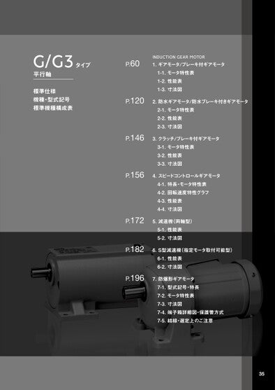 G/G3タイプ平行軸標準仕様機種・型式記号標準機種構成表P.60P.120P.146P.156P.172P.182P.196INDUCTIONGEARMOTOR1.ギアモータ/ブレーキ付ギアモータ1-1.モータ特性表1-2.性能表1-3.寸法図2.防水ギアモータ/防水ブレーキ付きギアモータ2-1.モータ特性表2-2.性能表2-3.寸法図3.クラッチ/ブレーキ付ギアモータ3-1.モータ特性表3-2.性能表3-3.寸法図4.スピードコントロールギアモータ4-1.特長・モータ特性表4-2.回転速度特性グラフ4-3.性能表4-4.寸法図5.減速機(両軸型)5-1.性能表5-2.寸法図6.S型減速機(指定モータ取付可能型)6-1.性能表6-2.寸法図7.防爆形ギアモータ7-1.型式記号・特長7-2.モータ特性表7-3.寸法図7-4.端子箱詳細図・保護管方式7-5.結線・選定上のご注意35