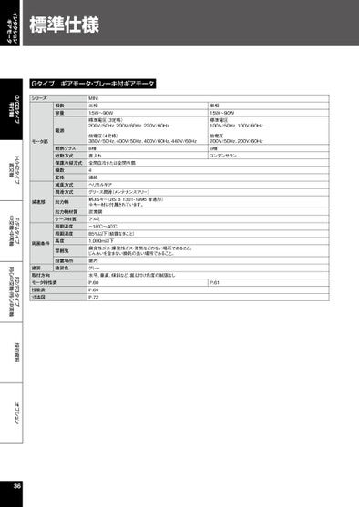 インダクションギアモータG/G3タイプ平行軸H/H2タイプ直交軸F/FAタイプ中空軸・中実軸F2/F3タイプ同心中空軸・同心中実軸技術資料オプション標準仕様Gタイプギアモータ・ブレーキ付ギアモータシリーズモータ部相数容量電源耐熱クラス始動方式保護冷却方式極数定格減速方式潤滑方式減速部出力軸出力軸材質ケース材質周囲温度周囲湿度高度雰囲気周囲条件設置場所塗装色塗装取付方向モータ特性表性能表寸法図MINI三相15W~90W標準電圧(3定格)200V/50Hz、200V/60Hz、220V/60Hz倍電圧(4定格)380V/50Hz、400V/50Hz、400V/60Hz、440V/60HzB種直入れ全閉自冷または全閉外扇4連続ヘリカルギアグリース潤滑(メンテナンスフリー)新JISキー(JISB1301-1996普通形)※キー材は付属されています。炭素鋼アルミ-10℃~40℃85%以下(結露なきこと)1,000m以下腐食性ガス・爆発性ガス・蒸気などのない場所であること。じんあいを含まない換気の良い場所であること。屋内グレー水平、垂直、傾斜など、据え付け角度の制限なしP.60P.64P.72単相15W~90W標準電圧100V/50Hz、100V/60Hz倍電圧200V/50Hz、200V/60HzB種コンデンサランP.6136