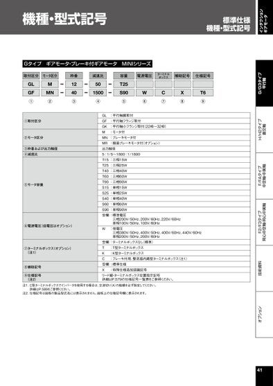 インダクションギアモータオプション技術資料F2/F3タイプ同心中空軸・同心中実軸F/FAタイプ中空軸・中実軸H/H2タイプ直交軸G/G3タイプ平行軸41機種・型式記号標準仕様機種・型式記号電源電圧ターミナルボックス補助記号仕様記号W⑥C⑦X⑧T6⑨容量T25S90⑤減速比501500④1240③NMM②GLGF①取付区分モータ区分枠番Gタイプギアモータ・ブレーキ付ギアモータMINIシリーズ①取付区分②モータ区分③枠番および出力軸径④減速比⑤モータ容量⑥電源電圧(倍電圧はオプション)⑦ターミナルボックス(オプション)(注1)⑧補助記号⑨仕様記号(注2)詳細はP.589をご参照ください。:モータ付:平行軸脚取付GLGF:平行軸フランジ取付GK:平行軸小フランジ取付(22枠~32枠)MMN:ブレーキモータ付MR:簡易ブレーキモータ付(オプション)出力軸径5:1/5~1800:1/1800T15:三相15WT25:三相25WT40:三相40WT60:三相60WT90:三相90WS15:単相15WS25:単相25WS40:単相40WS60:単相60WS90:単相90W空欄:標準電圧三相200V/50Hz、200V/60Hz、220V/60Hz単相100V/50Hz、100V/60HzW:倍電圧三相380V/50Hz、400V/50Hz、400V/60Hz、440V/60Hz単相200V/50Hz、200V/60Hz:T型ターミナルボックス:K型ターミナルボックス:ブレーキ付用、整流器内蔵型ターミナルボックス(注1)空欄:ターミナルボックスなし(標準)TKC空欄:標準仕様Xリード線・ターミナルボックス位置指示記号詳細はP.579の仕様記号一覧表をご参照ください。:特殊仕様追加認識記号注1.C型ターミナルボックスでインバータを使用する場合は、交流切り(A)の結線を必ず指定してください。注2.仕様記号は銘板の製品型式名には表示されません。銘板上の仕様記号欄に表示されます。