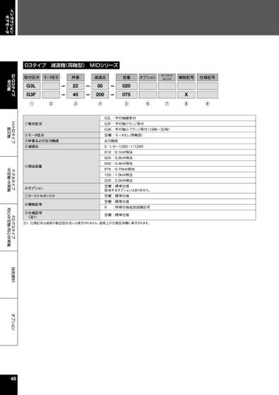 インダクションギアモータG/G3タイプ平行軸H/H2タイプ直交軸F/FAタイプ中空軸・中実軸F2/F3タイプ同心中空軸・同心中実軸技術資料オプションG3タイプ減速機(両軸型)MIDシリーズ取付区分モータ区分枠番減速比G3LG3F①②2240③50200④容量020075⑤オプションターミナルボックス補助記号仕様記号⑥⑦X⑧⑨①取付区分②モータ区分③枠番および出力軸径④減速比⑤相当容量⑥オプション⑦ターミナルボックス⑧補助記号⑨仕様記号(注1)G3L:平行軸脚取付G3F:平行軸フランジ取付G3K:平行軸小フランジ取付(18枠~32枠)空欄:モータなし(両軸型)出力軸径5:1/5~1200:1/1200010:0.1kW相当020:0.2kW相当040:0.4kW相当075:0.75kW相当150:1.5kW相当220:2.2kW相当空欄:標準仕様該当するオプションはありません。空欄:標準仕様空欄:標準仕様X:特殊仕様追加認識記号空欄:標準仕様注1.仕様記号は銘板の製品型式名には表示されません。銘板上の仕様記号欄に表示されます。48