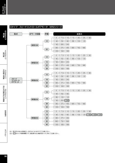 インダクションギアモータG/G3タイプ平行軸H/H2タイプ直交軸F/FAタイプ中空軸・中実軸F2/F3タイプ同心中空軸・同心中実軸技術資料オプションGタイプスピードコントロールギアモータMINIシリーズ型式4Pモータ容量枠番減速比単相15W単相25Wスピードコントロールギアモータ単相40W単相60W単相90W1/51/7.51/101/151/201/251/301/401/501/601/801/1001/1201/1601/2001/2401/3001/3751/4501/6001/7501/9001/12001/15001/18001/51/7.51/101/151/201/251/301/401/501/601/801/1001/1201/1601/2001/2401/3001/3751/4501/6001/7501/9001/12001/15001/18001/51/7.51/101/151/201/251/301/401/501/601/801/1001/1201/1601/2001/2401/3001/3751/4501/6001/7501/9001/12001/15001/18001/51/7.51/101/151/201/251/301/401/501/601/801/1001/1201/1601/2001/2401/3001/3751/4501/6001/7501/9001/12001/15001/18001/51/7.51/101/151/201/251/301/401/501/601/801/1001/1201/1601/2001/2401/3001/3751/4501/6001/7501/9001/12001/15001/180012221215222815182832151828321518283240注1.取付区分GKは枠番22~32のみになりますのでご注意ください。注2.はトルク制限機種です。性能表の出力軸許容トルクに特にご注意ください。56