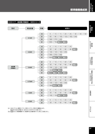 インダクションギアモータ標準機種構成表オプション技術資料F2/F3タイプ同心中空軸・同心中実軸F/FAタイプ中空軸・中実軸H/H2タイプ直交軸G/G3タイプ平行軸G3タイプ減速機(両軸型)MIDシリーズ型式相当容量枠番減速比0.1kW0.2kW減速機(両軸型)0.4kW0.75kW1.5kW2.2kW18222832182228324022283240502832405032405040501/51/101/151/201/251/301/401/501/601/801/1001/1201/1601/2001/3001/3751/4501/6001/7501/9001/12001/51/301/101/401/151/501/201/601/251/801/1001/1001/1201/1601/2001/3001/3751/4501/6001/7501/9001/12001/51/301/101/401/151/501/201/601/251/801/1001/1001/1201/1601/2001/3001/3751/4501/6001/7501/9001/12001/51/301/101/401/151/501/201/601/251/801/1001/1001/1201/1601/2001/3001/3751/4501/51/301/101/401/151/501/201/601/251/801/1001/1001/1201/1601/2001/51/301/101/401/151/501/201/601/251/801/100注1.G3タイプには、脚取付・フランジ取付・小フランジ取付の3種類あります。取付区分G3Kは枠番18~32のみになりますのでご注意ください。注2.はトルク制限機種です。性能表の出力軸許容トルクに特にご注意ください。57