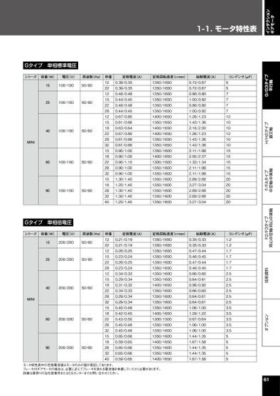 オプション技術資料F2/F3タイプ同心中空軸・同心中実軸F/FAタイプ中空軸・中実軸H/H2タイプ直交軸G/G3タイプ平行軸インダクションギアモータ1-1.モータ特性表Gタイプ単相標準電圧シリーズ容量(W)電圧(V)周波数(Hz)15100/10050/6025100/10050/6040100/10050/60MINI60100/10050/6090100/10050/60Gタイプ単相倍電圧シリーズ容量(W)電圧(V)周波数(Hz)15200/20050/6025200/20050/6040200/20050/60MINI60200/20050/6090200/20050/60枠番12221215222812151822283215182228321518283240枠番12221215222812151822283215182228321518283240定格電流(A)0.39/0.350.39/0.350.48/0.480.44/0.450.48/0.480.44/0.450.67/0.800.61/0.660.63/0.640.67/0.800.61/0.660.61/0.660.90/1.000.90/1.000.90/1.100.90/1.000.90/1.001.30/1.401.20/1.401.30/1.401.30/1.401.20/1.40定格電流(A)0.21/0.190.21/0.190.26/0.250.23/0.240.26/0.250.23/0.240.34/0.330.29/0.340.31/0.320.34/0.330.29/0.340.29/0.340.45/0.480.42/0.450.43/0.500.45/0.480.45/0.480.65/0.660.59/0.650.65/0.660.65/0.660.59/0.65定格回転速度(r/min)1350/16501350/16501350/16001350/16501350/16001350/16501400/16501350/16501400/16501400/16501350/16501350/16501350/16001400/16501300/15001350/16001350/16001350/16001350/16001350/16001350/16001350/1600定格回転速度(r/min)1350/16501350/16501350/16001350/16501350/16001350/16501350/16001350/16001400/16501350/16001350/16001350/16001350/16001400/16501300/15001350/16001350/16001350/16001400/16501350/16001350/16001400/1650モータ特性表中の定格電流値はモータのみの値が表記してあります。ブレーキ付ギアモータの場合は、必要に応じてブレーキを流れる電流値を考慮していただく必要があります。詳細は最寄りの当社営業所またはCSセンターまでお問い合わせください。始動電流(A)コンデンサ(μF)0.72/0.670.72/0.670.86/0.801.00/0.920.86/0.801.00/0.921.26/1.231.43/1.362.16/2.001.26/1.231.43/1.361.43/1.362.11/1.982.55/2.371.33/1.342.11/1.982.11/1.982.89/2.683.27/3.042.89/2.682.89/2.683.27/3.0455777712101012101015151515152020202020始動電流(A)コンデンサ(μF)0.35/0.330.35/0.330.47/0.440.46/0.450.47/0.440.46/0.450.66/0.600.64/0.610.98/0.920.66/0.600.64/0.610.64/0.611.06/1.001.29/1.220.67/0.641.06/1.001.06/1.001.44/1.351.67/1.581.44/1.351.44/1.351.67/1.581.21.21.71.71.71.72.52.52.52.52.52.53.53.53.53.53.55555561