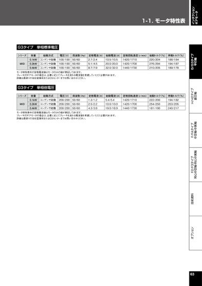 オプション技術資料F2/F3タイプ同心中空軸・同心中実軸F/FAタイプ中空軸・中実軸H/H2タイプ直交軸G/G3タイプ平行軸インダクションギアモータ1-1.モータ特性表G3タイプ単相標準電圧シリーズMID容量0.1kW0.2kW0.4kW始動方式コンデンサ始動コンデンサ始動コンデンサ始動電圧(V)100/100100/100100/100周波数(Hz)50/6050/6050/60定格電流(A)2.7/2.45.1/4.58.7/7.9始動電流(A)10.5/10.520.0/20.032.0/32.0モータ特性表中の定格電流値はモータのみの値が表記してあります。ブレーキ付ギアモータの場合は、必要に応じてブレーキを流れる電流値を考慮していただく必要があります。詳細は最寄りの当社営業所またはCSセンターまでお問い合わせください。G3タイプ単相倍電圧シリーズMID容量0.1kW0.2kW0.4kW始動方式コンデンサ始動コンデンサ始動コンデンサ始動電圧(V)200/200200/200200/200周波数(Hz)50/6050/6050/60定格電流(A)1.3/1.22.5/2.24.3/3.9始動電流(A)5.4/5.410.0/10.019.0/18.9モータ特性表中の定格電流値はモータのみの値が表記してあります。ブレーキ付ギアモータの場合は、必要に応じてブレーキを流れる電流値を考慮していただく必要があります。詳細は最寄りの当社営業所またはCSセンターまでお問い合わせください。定格回転速度(r/min)始動トルク(%)停動トルク(%)1420/17101420/17001440/1730220/204276/294210/205188/184194/187189/178定格回転速度(r/min)始動トルク(%)停動トルク(%)1420/17101420/17001440/1730222/200254/250181/190194/182203/205240/21763
