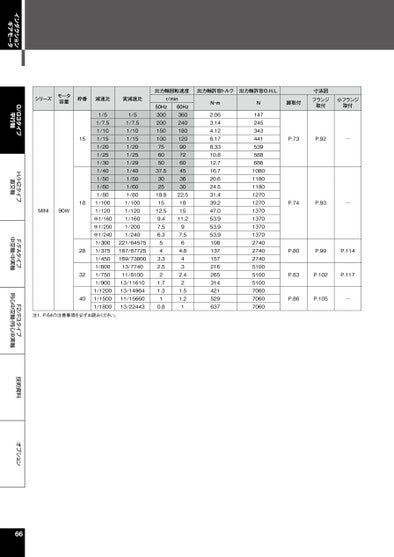 インダクションギアモータG/G3タイプ平行軸H/H2タイプ直交軸F/FAタイプ中空軸・中実軸F2/F3タイプ同心中空軸・同心中実軸技術資料オプションシリーズモータ容量MINI90W出力軸回転速度出力軸許容トルク出力軸許容O.H.L.枠番減速比実減速比r/min1/51/7.51/101/151/201/251/301/401/501/601/801/1001/120※1/160※1/200※1/2401/3001/3751/4501/6001/7501/9001/12001/15001/18001/51/7.51/101/151/201/251/291/401/501/601/801/1001/1201/1601/2001/240221/64575187/67725169/7380013/774011/810013/1161013/1496411/1566013/22443151828324050Hz30020015010075605037.5302518.81512.59.47.56.3543.32.521.71.310.860Hz36024018012090726045363022.5181511.297.564.8432.421.51.21N・m2.063.144.126.178.3310.812.716.720.624.531.439.247.053.953.953.9108137157216265314421529637N147245343441539588686108011801180127012701370137013701370274027402740510051005100706070607060寸法図フランジ取付小フランジ取付脚取付P.73P.92─P.74P.93─P.80P.99P.114P.83P.102P.117P.86P.105─注1.P.64の注意事項を必ずお読みください。66