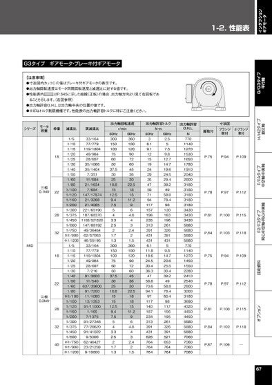 インダクションギアモータ1-2.性能表オプション技術資料F2/F3タイプ同心中空軸・同心中実軸F/FAタイプ中空軸・中実軸H/H2タイプ直交軸G/G3タイプ平行軸G3タイプギアモータ・ブレーキ付ギアモータ【注意事項】●寸法図内カッコ()の値はブレーキ付ギアモータの表示です。●出力軸回転速度はモータ同期回転速度と減速比に対する値です。●性能表内はP.545に示した結線(正転)の場合、出力軸方向より見て右回転であることを示します。右図参照)●出力軸許容O.H.L.は出力軸中央の位置の値です。●※印はトルク制限機種です。性能表の出力軸許容トルクに特にご注意ください。シリーズモータ容量枠番減速比実減速比r/min出力軸回転速度出力軸許容トルク1/51/101/151/201/251/301/401/501/601/801/1001/1201/1601/2001/3001/3751/4501/6001/750※1/900※1/12001/51/101/151/201/251/301/401/501/601/80※1/1001/1001/1201/1601/2001/3001/3751/4501/600※1/750※1/900※1/120033/16477/779119/180449/98428/69735/106635/14047/35111/68421/16347/684147/1797421/326821/4085221/65190187/683701183/521520147/8819249/3646462/5706346/5519533/16477/779119/180449/98428/6977/21691/360011/540637/3960091/720011/108013/135391/110001/1657/137591/2734877/2862091/410229/530062/4642723/212599/1060050Hz30015010075605037.5302518.81512.59.47.5543.32.521.71.330015010075605037.5302518.8151512.59.47.5543.32.521.71.360Hz36018012090726045363022.5181511.2964.8432.421.536018012090726045363022.518181511.2964.8432.421.518三相0.1kW22MID三相0.2kW28321822283240N・m50Hz60Hz36.19.1121519242935475971941171571962353133914314316.111.818.624.530.436.34758.870.694.1971171401872343133914316267647647642.557.59.812.714.719.624.529.439.24958.878.49813016319626132639143159.814.720.625.530.439.24958.878.480.498117156195261326391521653764764寸法図フランジ取付小フランジ取付脚取付P.75P.94P.109P.78P.97P.112P.81P.100P.115P.84P.103P.118P.75P.94P.109P.78P.97P.112P.81P.100P.115P.84P.103P.118P.87P.106─出力軸許容O.H.L.N7701140127015301650178019102040280031803180318031803180343034303430588058805880588077011401270145015502280241025402800300031803690432044504450588058805880706070607060706067