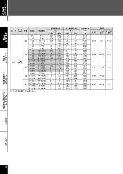 インダクションギアモータG/G3タイプ平行軸H/H2タイプ直交軸F/FAタイプ中空軸・中実軸F2/F3タイプ同心中空軸・同心中実軸技術資料オプションシリーズモータ容量MID三相0.4kW枠番減速比実減速比r/minN・m出力軸回転速度出力軸許容トルク出力軸許容O.H.L.22283240501/51/101/151/201/251/301/401/501/601/80※1/1001/1001/1201/1601/2001/300※1/375※1/450※1/600※1/750※1/900※1/12007/347/6849/7487/1367/1701/30221/8610187/9030169/984065/516655/54187/68877/936021/3328189/382727/216077/2932849/2160057/3536025/194485/433833/4066450Hz30015010075605037.5302518.8151512.59.47.5543.32.521.71.360Hz36018012090726045363022.518181511.2964.8432.421.550Hz12253648617394117140187193234281374431626764764122512251225122560Hz10213040506178981171561611952343133905216537641044122512251225N1140153017801910205033103690408044504450445063707640764076407060706070609800980098009800寸法図脚取付フランジ取付小フランジ取付P.78P.97P.112P.81P.100P.115P.84P.103P.118P.87P.106─P.89P.108─注1.P.67の注意事項を必ずお読みください。68