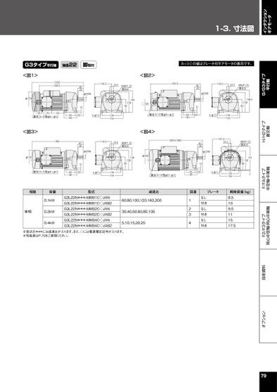 インダクションギアモータ1-3.⼨法図オプション技術資料F2/F3タイプ同心中空軸・同心中実軸F/FAタイプ中空軸・中実軸H/H2タイプ直交軸G/G3タイプ平行軸G3タイプ平行軸軸径22脚取付カッコ()の値はブレーキ付ギアモータの表示です。<図1>φ135(350)299.54035φ22h6116.524.5M8xP1.25深さ206<図2>349.514913990□1264-φ11130154適合コード径φ8~φ12116.524.5M8xP1.25深さ20φ22h6640351255196590□703584適合コード径φ8~φ12<図3>φ135360適合コード径φ8~φ12196590196590125540351255<図4>389.5(398)116.524.5M8xP1.25深さ20φ22h66φ162156139904-φ11130154適合コード径φ8~φ12φ22h6403512551965904-φ11130154131.524.56156.513990M8xP1.25深さ20174139904-φ111301547相数容量型式減速比図番ブレーキ概略質量(kg)0.1kW単相0.2kW0.4kWG3L22N***-MM01C◇JANG3L22N***-MM01C◇JAB2G3L22N***-MM02C◇JANG3L22N***-MM02C◇JAB2G3L22N***-MM04C◇JANG3L22N***-MM04C◇JAB260,80,100,120,160,20030,40,50,60,80,1005,10,15,20,25※型式の***には減速比が入ります。また、◇には電源電圧記号が入ります。※性能表はP.70をご参照ください。1234なし付きなし付きなし付き8.5109.5111517.579