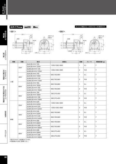 インダクションギアモータG/G3タイプ平行軸H/H2タイプ直交軸F/FAタイプ中空軸・中実軸F2/F3タイプ同心中空軸・同心中実軸技術資料オプションGタイプ平行軸軸径28脚取付カッコ()の値はブレーキ付ギアモータの表示です。<図1>282.5300ℓ904540156536.590125<図2>31M8×P1.25深さ20φ28h68167110944-φ11140175319300ℓ(300ℓ)36.59012545401565φ28h631M8×P1.25深さ2081671104-φ11140175減速比図番ブレーキ概略質量(kg)1200,1500,18001200,1500,1800600,750,900600,750,900600,750,900600,750,900300,375,450300,375,4501200,1500,18001200,1500,1800600,750,900600,750,900600,750,900600,750,900300,375,450300,375,4501212121212121212なし付きなし付きなし付きなし付きなし付きなし付きなし付きなし付き7777777777777777相数容量三相単相25W40W60W90W25W40W60W90W型式GLM-28-***-T25GLM-28-***-T25WGLMN-28-***-T25GLMN-28-***-T25WGLM-28-***-T40GLM-28-***-T40WGLMN-28-***-T40GLMN-28-***-T40WGLM-28-***-T60GLM-28-***-T60WGLMN-28-***-T60GLMN-28-***-T60WGLM-28-***-T90GLM-28-***-T90WGLMN-28-***-T90GLMN-28-***-T90WGLM-28-***-S25GLM-28-***-S25WGLMN-28-***-S25GLMN-28-***-S25WGLM-28-***-S40GLM-28-***-S40WGLMN-28-***-S40GLMN-28-***-S40WGLM-28-***-S60GLM-28-***-S60WGLMN-28-***-S60GLMN-28-***-S60WGLM-28-***-S90GLM-28-***-S90WGLMN-28-***-S90GLMN-28-***-S90W※型式の***には減速比が入ります。※性能表はP.64をご参照ください。80