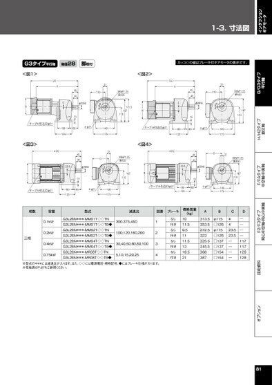 インダクションギアモータ1-3.⼨法図オプション技術資料F2/F3タイプ同心中空軸・同心中実軸F/FAタイプ中空軸・中実軸H/H2タイプ直交軸G/G3タイプ平行軸G3タイプ平行軸軸径28脚取付カッコ()の値はブレーキ付ギアモータの表示です。<図1>B(A)A4540Cφ28h6311108ケーブル引込口φ271565901254-φ11140175<図3>(A)A454023.5φ28h631D8M8xP1.25深さ20<図2>M8xP1.25深さ20171.5167110B(A)A4540Cφ28h6311108ケーブル引込口φ27<図4>90125(A)A156545404-φ11140175D3123.5φ28h6Bケーブル引込口φ271565901254-φ11140175167110Bケーブル引込口φ279012515654-φ11140175M8xP1.25深さ20167110M8xP1.25深さ20167110相数容量型式減速比図番ブレーキ概略質量(kg)AB三相0.1kW0.2kW0.4kW0.75kWG3L28N***-MM01T◇◇TNG3L28N***-MM01T◇◇TB◆G3L28N***-MM02T◇◇TNG3L28N***-MM02T◇◇TB◆G3L28N***-MM04T◇◇TNG3L28N***-MM04T◇◇TB◆G3L28N***-MR08T◇◇TNG3L28N***-MR08T◇◇TB◆300,375,450100,120,160,20030,40,50,60,80,1005,10,15,20,251234なし付きなし付きなし付きなし付き1011.59.51111.51318.521313.5353.5272.5323325.5345.5368387φ115□126φ115□126□137□137□154□154C4423.523.5――――D――――117117128128※型式の***には減速比が入ります。また、◇◇には電源電圧・規格記号、◆にはブレーキ仕様が入ります。※性能表はP.67をご参照ください。81