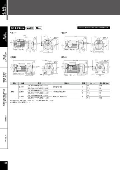 インダクションギアモータG/G3タイプ平行軸H/H2タイプ直交軸F/FAタイプ中空軸・中実軸F2/F3タイプ同心中空軸・同心中実軸技術資料オプションG3タイプ平行軸軸径28脚取付カッコ()の値はブレーキ付ギアモータの表示です。<図1>φ135(419)368.535□7084適合コード径φ8~φ124540φ28h6116.5815654-φ11140175490125<図2>31M8xP1.25深さ20362.54540192181.5167110□126適合コード径φ8~φ12<図4>31M8xP1.25深さ20116.5817216711023.5φ28h615654-φ1190125140175<図3>φ135373適合コード径φ8~φ124540156523.590125116.58φ28h631M8xP1.25深さ20φ1621721671104-φ11140175適合コード径φ8~φ1290125405.5(414)454023.5φ28h6131.5831M8xP1.25深さ20189.516711015654-φ11140175相数容量型式減速比図番ブレーキ概略質量(kg)0.1kW単相0.2kW0.4kWG3L28N***-MM01C◇JANG3L28N***-MM01C◇JAB2G3L28N***-MM02C◇JANG3L28N***-MM02C◇JAB2G3L28N***-MM04C◇JANG3L28N***-MM04C◇JAB2300,375,450100,120,160,20030,40,50,60,80,100※型式の***には減速比が入ります。また、◇には電源電圧記号が入ります。※性能表はP.70をご参照ください。1234なし付きなし付きなし付き11.51311.5131719.582