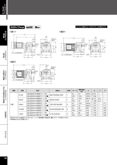 インダクションギアモータG/G3タイプ平行軸H/H2タイプ直交軸F/FAタイプ中空軸・中実軸F2/F3タイプ同心中空軸・同心中実軸技術資料オプションG3タイプ平行軸軸径32脚取付カッコ()の値はブレーキ付ギアモータの表示です。<図1>(A)A<図2>35110M10xP1.5深さ255550BCφ32h610ケーブル引込口φ27<図3>(A)ABケーブル引込口φ2713016828.513016818704-φ13198130Bケーブル引込口φ27170208D3555501870M10xP1.5深さ25198130φ32h6104-φ13170208(A)A28.5130168φ32h655501835D10M10xP1.5深さ25198130704-φ13170208相数容量型式減速比図番ブレーキ概略質量(kg)AB0.1kW0.2kW三相0.4kW0.75kW1.5kWG3L32N***-MM01T◇◇TNG3L32N***-MM01T◇◇TB◆G3L32N***-MM02T◇◇TNG3L32N***-MM02T◇◇TB◆G3L32N***-MM04T◇◇TNG3L32N***-MM04T◇◇TB◆G3L32N***-MR08T◇◇TNG3L32N***-MR08T◇◇TB◆G3L32N***-MR15T◇◇TNG3L32N***-MR15T◇◇TB◆600,750,900,1200300,375,450100,120,160,20030,40,50,60,80,1005,10,15,20,2511233なし付きなし付きなし付きなし付きなし付き1314.513.51514.5162224.52831.5※型式の***には減速比が入ります。また、◇◇には電源電圧・規格記号、◆にはブレーキ仕様が入ります。※性能表はP.67をご参照ください。332.5372.5367.5418344.5364.5397416433462φ115□126φ115□126□137□137□154□154□178□178C-1-15.55.5――――――D――――11711712812813913984