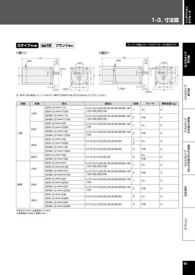 インダクションギアモータ1-3.⼨法図オプション技術資料F2/F3タイプ同心中空軸・同心中実軸F/FAタイプ中空軸・中実軸H/H2タイプ直交軸G/G3タイプ平行軸Gタイプ平行軸軸径12フランジ取付カッコ()の値はブレーキ付ギアモータの表示です。<図1>162300ℓ76118<図2>2220φ12h6(φ35)413.521437680200300ℓ3.527.54-φ6.5323276(300ℓ)注.斜字寸法は黒皮になっていますので、相手穴は斜字寸法に径で0.5mm以上プラスしてください。2220(φ35)φ12h6413.53232763.527.54-φ6.5118217643相数容量三相15W25W40W60W15W単相25W40W型式GFM-12-***-T15GFM-12-***-T15WGFMN-12-***-T15GFMN-12-***-T15WGFM-12-***-T25GFM-12-***-T25WGFMN-12-***-T25GFMN-12-***-T25WGFM-12-***-T40GFM-12-***-T40WGFMN-12-***-T40GFMN-12-***-T40WGFM-12-***-T60GFMN-12-***-T60GFM-12-***-S15GFM-12-***-S15WGFMN-12-***-S15GFMN-12-***-S15WGFM-12-***-S25GFM-12-***-S25WGFMN-12-***-S25GFMN-12-***-S25WGFM-12-***-S40GFM-12-***-S40WGFMN-12-***-S40GFMN-12-***-S40W※型式の***には減速比が入ります。※性能表はP.64をご参照ください。減速比図番ブレーキ概略質量(kg)5,7.5,10,15,20,25,30,40,50,60,80,100,120,160,200,2405,7.5,10,15,20,25,30,40,50,60,80,100,120,160,200,2405,7.5,10,15,20,25,30,40,50,60,80,100,1205,7.5,10,15,20,25,30,40,50,60,80,100,1205,7.5,10,15,20,25,30,40,50,605,7.5,10,15,20,25,30,40,50,605,7.5,10,15,20,25,305,7.5,10,15,20,25,30,40,50,60,80,100,120,160,200,2405,7.5,10,15,20,25,30,40,50,60,80,100,120,160,200,2405,7.5,10,15,20,25,30,40,50,60,80,100,1205,7.5,10,15,20,25,30,40,50,60,80,100,1205,7.5,10,15,20,25,30,40,50,605,7.5,10,15,20,25,30,40,50,6012121222121222なし付きなし付きなし付きなし付きなし付きなし付きなし付き222222222222291