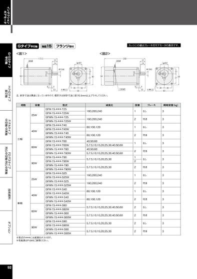 インダクションギアモータG/G3タイプ平行軸H/H2タイプ直交軸F/FAタイプ中空軸・中実軸F2/F3タイプ同心中空軸・同心中実軸技術資料オプションGタイプ平行軸軸径15フランジ取付カッコ()の値はブレーキ付ギアモータの表示です。<図1>172.5300ℓ902724φ15h613(φ40)517<図2>209300ℓ259051942724φ15h61394334-φ6.5383890(300ℓ)94334-φ6.5注.斜字寸法は黒皮になっていますので、相手穴は斜字寸法に径で0.5mm以上プラスしてください。(φ40)517383890259051減速比図番ブレーキ概略質量(kg)160,200,240160,200,24080,100,12080,100,12040,50,605,7.5,10,15,20,25,30,40,50,6040,50,605,7.5,10,15,20,25,30,40,50,605,7.5,10,15,20,25,305,7.5,10,15,20,25,30160,200,240160,200,24080,100,12080,100,1205,7.5,10,15,20,25,30,40,50,605,7.5,10,15,20,25,30,40,50,605,7.5,10,15,20,25,305,7.5,10,15,20,25,3012121212212122222なし付きなし付きなし付きなし付きなし付きなし付きなし付きなし付き3333333333333333相数容量三相単相25W40W60W90W25W40W60W90W型式GFM-15-***-T25GFM-15-***-T25WGFMN-15-***-T25GFMN-15-***-T25WGFM-15-***-T40GFM-15-***-T40WGFMN-15-***-T40GFMN-15-***-T40WGFM-15-***-T60GFM-15-***-T60WGFMN-15-***-T60GFMN-15-***-T60WGFM-15-***-T90GFM-15-***-T90WGFMN-15-***-T90GFMN-15-***-T90WGFM-15-***-S25GFM-15-***-S25WGFMN-15-***-S25GFMN-15-***-S25WGFM-15-***-S40GFM-15-***-S40WGFMN-15-***-S40GFMN-15-***-S40WGFM-15-***-S60GFM-15-***-S60WGFMN-15-***-S60GFMN-15-***-S60WGFM-15-***-S90GFM-15-***-S90WGFMN-15-***-S90GFMN-15-***-S90W※型式の***には減速比が入ります。※性能表はP.64をご参照ください。92