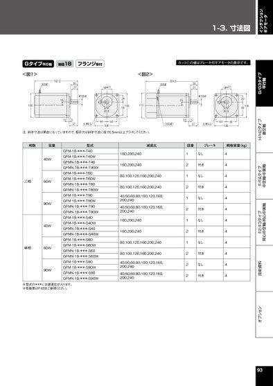 インダクションギアモータ1-3.⼨法図オプション技術資料F2/F3タイプ同心中空軸・同心中実軸F/FAタイプ中空軸・中実軸H/H2タイプ直交軸G/G3タイプ平行軸Gタイプ平行軸軸径18フランジ取付カッコ()の値はブレーキ付ギアモータの表示です。<図1>187.5300ℓ106153027φ18h6(φ47)620.5<図2>224.5300ℓ29106591103027φ18h615105374-φ8.54444106(300ℓ)105374-φ8.5注.斜字寸法は黒皮になっていますので、相手穴は斜字寸法に径で0.5mm以上プラスしてください。(φ47)620.544441062910659相数容量40W三相60W90W40W単相60W90W型式GFM-18-***-T40GFM-18-***-T40WGFMN-18-***-T40GFMN-18-***-T40WGFM-18-***-T60GFM-18-***-T60WGFMN-18-***-T60GFMN-18-***-T60WGFM-18-***-T90GFM-18-***-T90WGFMN-18-***-T90GFMN-18-***-T90WGFM-18-***-S40GFM-18-***-S40WGFMN-18-***-S40GFMN-18-***-S40WGFM-18-***-S60GFM-18-***-S60WGFMN-18-***-S60GFMN-18-***-S60WGFM-18-***-S90GFM-18-***-S90WGFMN-18-***-S90GFMN-18-***-S90W※型式の***には減速比が入ります。※性能表はP.65をご参照ください。減速比図番ブレーキ概略質量(kg)160,200,240160,200,24080,100,120,160,200,24080,100,120,160,200,24040,50,60,80,100,120,160,200,24040,50,60,80,100,120,160,200,240160,200,240160,200,24080,100,120,160,200,24080,100,120,160,200,24040,50,60,80,100,120,160,200,24040,50,60,80,100,120,160,200,240121212121222なし付きなし付きなし付きなし付きなし付きなし付き44444444444493
