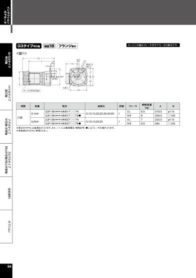 インダクションギアモータG/G3タイプ平行軸H/H2タイプ直交軸F/FAタイプ中空軸・中実軸F2/F3タイプ同心中空軸・同心中実軸技術資料オプションG3タイプ平行軸軸径18フランジ取付カッコ()の値はブレーキ付ギアモータの表示です。<図1>(A)AB1016.53533027φ145h7φ18h6110620.5071.D.C.PM6xP1.0深さ157780157ケーブル引込口φ274-φ11154相数容量型式減速比図番ブレーキ三相0.1kW0.2kWG3F18N***-MM01T◇◇TNG3F18N***-MM01T◇◇TB◆G3F18N***-MM02T◇◇TNG3F18N***-MM02T◇◇TB◆5,10,15,20,25,30,40,505,10,15,20,2511なし付きなし付き※型式の***には減速比が入ります。また、◇◇には電源電圧・規格記号、◆にはブレーキ仕様が入ります。※性能表はP.67をご参照ください。概略質量(kg)6.5878.5A218.5258.5233.5284Bφ115□126φ115□12694