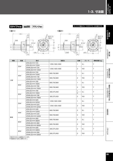 インダクションギアモータ1-3.⼨法図オプション技術資料F2/F3タイプ同心中空軸・同心中実軸F/FAタイプ中空軸・中実軸H/H2タイプ直交軸G/G3タイプ平行軸99Gタイプ平行軸軸径28フランジ取付カッコ()の値はブレーキ付ギアモータの表示です。M8×P1.25深さ20215.D.C.Pφ170h7318φ28h693105.54-φ111864540045319300ℓ36.5(300ℓ)15<図1><図2>M8×P1.25深さ20215.D.C.P282.54540300ℓφ170h731836.590φ28h693105.5944-φ1118604515相数容量三相単相25W40W60W90W25W40W60W90W型式GFM-28-***-T25GFM-28-***-T25WGFMN-28-***-T25GFMN-28-***-T25WGFM-28-***-T40GFM-28-***-T40WGFMN-28-***-T40GFMN-28-***-T40WGFM-28-***-T60GFM-28-***-T60WGFMN-28-***-T60GFMN-28-***-T60WGFM-28-***-T90GFM-28-***-T90WGFMN-28-***-T90GFMN-28-***-T90WGFM-28-***-S25GFM-28-***-S25WGFMN-28-***-S25GFMN-28-***-S25WGFM-28-***-S40GFM-28-***-S40WGFMN-28-***-S40GFMN-28-***-S40WGFM-28-***-S60GFM-28-***-S60WGFMN-28-***-S60GFMN-28-***-S60WGFM-28-***-S90GFM-28-***-S90WGFMN-28-***-S90GFMN-28-***-S90W※型式の***には減速比が入ります。※性能表はP.64をご参照ください。減速比図番ブレーキ概略質量(kg)1200,1500,18001200,1500,1800600,750,900600,750,900600,750,900600,750,900300,375,450300,375,4501200,1500,18001200,1500,1800600,750,900600,750,900600,750,900600,750,900300,375,450300,375,45012121212212222222なし付きなし付きなし付きなし付きなし付きなし付きなし付きなし付き7777777777777777