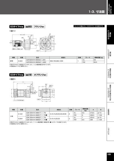 インダクションギアモータ1-3.⼨法図オプション技術資料F2/F3タイプ同心中空軸・同心中実軸F/FAタイプ中空軸・中実軸H/H2タイプ直交軸G/G3タイプ平行軸G3タイプ平行軸軸径50フランジ取付カッコ()の値はブレーキ付ギアモータの表示です。<図1>φ162560.5(569)φ208357570252適合コード径φ8~φ12相数容量単相0.4kW063.D.C.PM12xP1.75深さ30150323.553.173.5φ50h614φ270h73004-φ22型式減速比図番ブレーキ概略質量(kg)G3F50N***-MM04C◇JANG3F50N***-MM04C◇JAB2600,750,900,12001なし付き6365.5※型式の***には減速比が入ります。また、◇には電源電圧記号が入ります。※性能表はP.71をご参照ください。G3タイプ平行軸軸径18小フランジ取付<図2>(A)AB1016.53643027φ50h7φ18h6110620.5M6xP1.0深さ1539487180ケーブル引込口φ274-φ8.65555128相数容量型式減速比図番ブレーキ三相0.1kW0.2kWG3K18N***-MM01T◇◇TNG3K18N***-MM01T◇◇TB◆G3K18N***-MM02T◇◇TNG3K18N***-MM02T◇◇TB◆5,10,15,20,25,30,40,505,10,15,20,2522なし付きなし付き※型式の***には減速比が入ります。また、◇◇には電源電圧・規格記号、◆にはブレーキ仕様が入ります。※性能表はP.67をご参照ください。概略質量(kg)6.5878.5A218.5258.5233.5284Bφ115□126φ115□126109