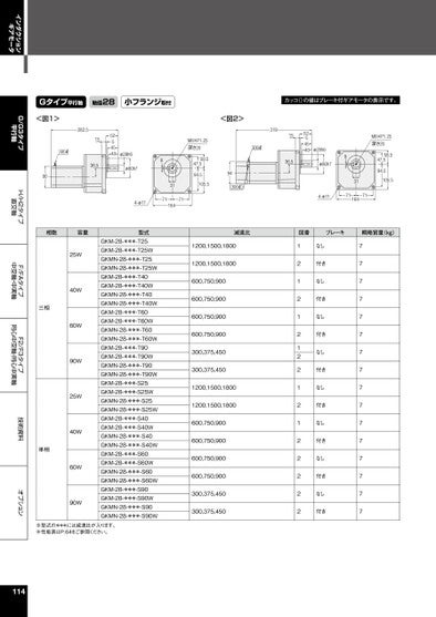 インダクションギアモータG/G3タイプ平行軸H/H2タイプ直交軸F/FAタイプ中空軸・中実軸F2/F3タイプ同心中空軸・同心中実軸技術資料オプションGタイプ平行軸軸径28小フランジ取付カッコ()の値はブレーキ付ギアモータの表示です。<図1>282.5300ℓ52545401536.5φ28h6φ80h790<図2>94(300ℓ)M8×P1.25深さ2058.547.594.5105.58314-φ117171164300ℓ3191536.55254540φ28h6φ80h78314-φ117116471M8×P1.25深さ2058.547.594.5105.5減速比図番ブレーキ概略質量(kg)1200,1500,18001200,1500,1800600,750,900600,750,900600,750,900600,750,900300,375,450300,375,4501200,1500,18001200,1500,1800600,750,900600,750,900600,750,900600,750,900300,375,450300,375,45012121212212122222なし付きなし付きなし付きなし付きなし付きなし付きなし付きなし付き7777777777777777相数容量三相単相25W40W60W90W25W40W60W90W型式GKM-28-***-T25GKM-28-***-T25WGKMN-28-***-T25GKMN-28-***-T25WGKM-28-***-T40GKM-28-***-T40WGKMN-28-***-T40GKMN-28-***-T40WGKM-28-***-T60GKM-28-***-T60WGKMN-28-***-T60GKMN-28-***-T60WGKM-28-***-T90GKM-28-***-T90WGKMN-28-***-T90GKMN-28-***-T90WGKM-28-***-S25GKM-28-***-S25WGKMN-28-***-S25GKMN-28-***-S25WGKM-28-***-S40GKM-28-***-S40WGKMN-28-***-S40GKMN-28-***-S40WGKM-28-***-S60GKM-28-***-S60WGKMN-28-***-S60GKMN-28-***-S60WGKM-28-***-S90GKM-28-***-S90WGKMN-28-***-S90GKMN-28-***-S90W※型式の***には減速比が入ります。※性能表はP.64をご参照ください。114
