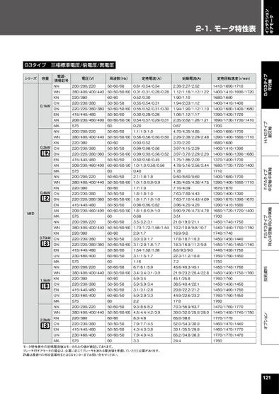 2-1.モータ特性表インダクションギアモータオプション技術資料F2/F3タイプ同心中空軸・同心中実軸F/FAタイプ中空軸・中実軸H/H2タイプ直交軸G/G3タイプ平行軸G3タイプ三相標準電圧/倍電圧/異電圧シリーズ容量MID0.1kW0.2kW0.4kW0.75kW1.5kW2.2kW電源・規格記号NNWNKNCNDNENANMANNWNKNCNDNENANMANNWNKNCNDNENANMANNWNKNCNDNENUNMANNWNKNCNENUNMANNWNKNCNENUNMA電圧(V)周波数(Hz)定格電流(A)始動電流(A)定格回転速度(r/min)200/200/220380/400/400/440220/380220/230/380220/220/380/380415/440/480208/230/460/400575200/200/220380/400/400/440220/380220/230/380220/220/380/380415/440/480208/230/460/400575200/200/220380/400/400/440220/380220/230/380220/220/380/380415/440/480208/230/460/400575200/200/220380/400/400/440220/380220/230/380220/220/380/380415/440/480230/460/400575200/200/220380/400/400/440220/380220/230/380415/440/480230/460/400575200/200/220380/400/400/440220/380220/230/380415/440/480230/460/40057550/60/6050/50/60/6060/6050/50/5050/60/50/6050/50/6060/60/60/506050/60/6050/50/60/6060/6050/50/5050/60/50/6050/50/6060/60/60/506050/60/6050/50/60/6060/6050/50/5050/60/50/6050/50/6060/60/60/506050/60/6050/50/60/6060/6050/50/5050/60/50/6050/50/6060/60/506050/60/6050/50/60/6060/6050/50/5050/50/6060/60/506050/60/6050/50/60/6060/6050/50/5050/50/6060/60/50600.61/0.54/0.540.31/0.31/0.28/0.280.52/0.300.55/0.54/0.310.55/0.52/0.31/0.300.30/0.29/0.260.54/0.57/0.29/0.310.201.1/1.0/1.00.56/0.56/0.50/0.500.93/0.520.99/0.98/0.560.99/0.93/0.56/0.520.50/0.50/0.451.0/1.0/0.50/0.560.402.1/1.8/1.81.0/1.0/0.9/0.91.7/1.01.8/1.8/1.01.8/1.7/1.0/1.00.96/0.95/0.821.8/1.8/0.9/1.00.683.5/3.2/3.11.73/1.72/1.58/1.542.9/1.73.0/3.0/1.73.1/2.9/1.8/1.71.54/1.52/1.363.1/1.5/1.71.166.7/6.1/5.93.4/3.4/3.1/3.05.9/3.45.9/5.9/3.43.1/3.1/2.85.9/2.9/3.32.29.3/8.6/8.24.5/4.4/4.2/3.98.3/4.87.9/7.7/4.54.3/4.3/3.87.9/4.0/4.53.32.39/2.27/2.521.12/1.18/1.12/1.221.90/1.101.94/2.03/1.121.94/1.90/1.12/1.101.06/1.12/1.172.35/2.62/1.26/1.210.874.70/4.35/4.852.29/2.38/2.29/2.483.70/2.203.97/4.15/2.293.97/3.70/2.29/2.201.75/1.86/2.004.78/5.16/2.56/2.441.789.50/8.60/9.604.35/4.65/4.30/4.757.10/4.097.63/7.88/4.437.63/7.10/4.43/4.093.96/4.20/4.208.90/9.76/4.73/4.783.5121.8/19.0/21.110.2/10.8/9.8/10.716.9/9.817.8/18.7/10.319.3/16.9/11.2/9.88.6/9.3/9.022.3/11.2/10.87.245.6/40.3/45.121.9/23.2/20.4/22.845.1/25.838.5/40.4/22.120.8/22.2/21.244.9/22.6/23.217.070.3/56.9/63.730.0/32.0/25.0/28.065.0/38.052.0/54.3/30.033.1/35.5/29.865.2/34.8/36.324.41410/1690/17101400/1410/1690/17201680/16801400/1410/14001400/1680/1400/16801390/1420/17201690/1730/1730/141017001400/1680/17001390/1400/1680/17101680/16801400/1410/13901400/1680/1390/16801370/1400/17001680/1720/1720/140017101400/1680/17001390/1400/1680/17101670/16701390/1400/13901390/1670/1390/16701390/1410/16801680/1720/1720/140017001450/1740/17501440/1450/1740/17501740/17401450/1450/14401450/1740/1450/17401440/1450/17501760/1760/145017501450/1740/17601450/1450/1750/17601760/17601450/1450/14501450/1460/17601760/1760/145017601470/1760/17701440/1450/1740/17501770/17701460/1470/14401460/1470/17701770/1770/14701760モータ特性表中の定格電流値はモータのみの値が表記してあります。ブレーキ付ギアモータの場合は、必要に応じてブレーキを流れる電流値を考慮していただく必要があります。詳細は最寄りの当社営業所またはCSセンターまでお問い合わせください。121