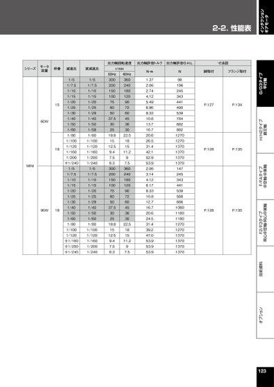 2-2.性能表インダクションギアモータオプション技術資料F2/F3タイプ同心中空軸・同心中実軸F/FAタイプ中空軸・中実軸H/H2タイプ直交軸G/G3タイプ平行軸シリーズモータ容量枠番減速比実減速比r/min出力軸回転速度出力軸許容トルク出力軸許容O.H.L.寸法図60W151890W18MINI1/51/7.51/101/151/201/251/301/401/501/601/801/1001/1201/1601/200※1/2401/51/7.51/101/151/201/251/301/401/501/601/801/1001/120※1/160※1/200※1/2401/51/7.51/101/151/201/251/291/401/501/581/801/1001/1201/1601/2001/2401/51/7.51/101/151/201/251/291/401/501/601/801/1001/1201/1601/2001/24050Hz30020015010075605037.5302518.81512.59.47.56.330020015010075605037.5302518.81512.59.47.56.360Hz36024018012090726045363022.5181511.297.536024018012090726045363022.5181511.297.5脚取付フランジ取付P.127P.134P.128P.135P.128P.135N・m1.372.062.744.125.496.968.3310.813.716.720.626.531.442.152.953.92.063.144.126.178.3310.812.716.720.624.531.439.247.053.953.953.9N98196245343441490539784882882127012701370137013701370147245343441539588686108011801180127012701370137013701370123