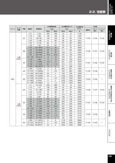 2-2.性能表インダクションギアモータオプション技術資料F2/F3タイプ同心中空軸・同心中実軸F/FAタイプ中空軸・中実軸H/H2タイプ直交軸G/G3タイプ平行軸シリーズモータ容量MID三相0.4kW三相0.75kW枠番減速比実減速比r/minN・m出力軸回転速度出力軸許容トルク出力軸許容O.H.L.1/51/101/151/201/251/301/401/501/601/80※1/1001/1001/1201/1601/2001/300※1/375※1/450※1/600※1/750※1/900※1/12001/51/101/151/201/251/301/401/501/601/80※1/1001/1001/1201/1601/2001/300※1/375※1/4507/347/6849/7487/1367/1701/30221/8610187/9030169/984065/516655/54187/68877/936021/3328189/382727/216077/2932849/2160057/3536025/194485/433833/4066491/4591/1091/13605/1027/1703/9213/51611/54013/77413/103211/108091/900077/94009/14009/1750211/6201394/3610365/2916722283240502832405050Hz30015010075605037.5302518.8151512.59.47.5543.32.521.71.330015010075605037.5302518.8151512.59.47.5543.360Hz36018012090726045363022.518181511.2964.8432.421.536018012090726045363022.518181511.2964.8450Hz1225364861739411714018719323428137443162676476412251225122512252345689111413617522026435136243952770376411761225122560Hz10213040506178981171561611952343133905216537641044122512251225193857759411414618322029330236643958573297812251225N1140153017801910205033103690408044504450445063707640764076407060706070609800980098009800165022802800305031805220547057806080618067709170917091709170980098009800寸法図フランジ取付小フランジ取付脚取付P.129P.136P.142P.130P.137P.143P.131P.138P.144P.132P.139―P.133P.140―P.130P.137P.143P.131P.138P.144P.132P.139―P.133P.140―125