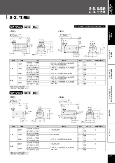 インダクションギアモータ2-2.性能表2-3.寸法図オプション技術資料F2/F3タイプ同心中空軸・同心中実軸F/FAタイプ中空軸・中実軸H/H2タイプ直交軸G/G3タイプ平行軸2-3.⼨法図Gタイプ平行軸軸径12脚取付カッコ()の値はブレーキ付ギアモータの表示です。<図1>キャブタイヤケーブルφ7.62000mm176148.534761135509.5相数容量三相単相15W25W40W15W25W27.52220φ12h64613.54354-φ6.57690型式GLW-12-***-T15GLV-12-***-T15GLW-12-***-T25GLV-12-***-T25GLW-12-***-T40GLV-12-***-T40GLW-12-***-S15GLV-12-***-S15GLW-12-***-S25GLV-12-***-S25※型式の***には減速比が入ります。※性能表はP.122をご参照ください。Gタイプ平行軸軸径15脚取付<図3>キャブタイヤケーブルφ7.62000mm186.5153.5349013332724φ15h6461757.54140564-φ6.590104相数容量三相単相25W40W60W25W40W型式GLW-15-***-T25GLV-15-***-T25GLW-15-***-T40GLV-15-***-T40GLW-15-***-T60GLV-15-***-T60GLW-15-***-S25GLV-15-***-S25GLW-15-***-S40GLV-15-***-S40※型式の***には減速比が入ります。※性能表はP.122をご参照ください。<図2>キャブタイヤケーブルφ7.72000mm198170.5223410382557φ61.5761127.52220φ12h64613.54103825573535504-φ6.57690減速比5,7.5,10,15,20,25,30,40,50,60,80,100,120,160,200,2405,7.5,10,15,20,25,30,40,50,60,80,100,1205,7.5,10,15,20,25,30,40,50,605,7.5,10,15,20,25,30,40,50,60,80,100,120,160,200,2405,7.5,10,15,20,25,30,40,50,60,80,100,120図番1212121212ブレーキ概略質量(kg)なし付きなし付きなし付きなし付きなし付き22222<図4>キャブタイヤケーブルφ7.72000mm21017723.534117.597658φ779013332724φ15h646175117.5976584140564-φ6.590104減速比160,200,24080,100,1205,7.5,10,15,20,25,30,40,50,60160,200,2405,7.5,10,15,20,25,30,40,50,60,80,100,120図番3434343434ブレーキ概略質量(kg)なし付きなし付きなし付きなし付きなし付き33333127