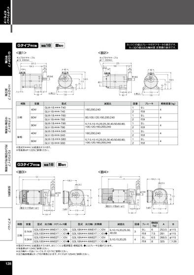 インダクションギアモータG/G3タイプ平行軸H/H2タイプ直交軸F/FAタイプ中空軸・中実軸F2/F3タイプ同心中空軸・同心中実軸技術資料オプションGタイプ平行軸軸径18脚取付カッコ()の値はブレーキ付ギアモータの表示です。カッコ[]の値は出力軸材質炭素鋼の表示です。<図2>キャブタイヤケーブルφ7.72000mm22518823.534130.51137510φ7710637302715φ18h64620.564060474-φ8.5110130130.51137510減速比160,200,24080,100,120,160,200,2405,7.5,10,15,20,25,30,40,50,60,80,100,120,160,200,240160,200,2405,7.5,10,15,20,25,30,40,50,60,80,100,120,160,200,240図番1212121212ブレーキ概略質量(kg)なし付きなし付きなし付きなし付きなし付き44444<図1>キャブタイヤケーブルφ7.62000mm201.5164.53410637302715φ18h64620.567.54060474-φ8.5110130相数容量三相単相40W60W90W40W60W型式GLW-18-***-T40GLV-18-***-T40GLW-18-***-T60GLV-18-***-T60GLW-18-***-T90GLV-18-***-T90GLW-18-***-S40GLV-18-***-S40GLW-18-***-S60GLV-18-***-S60※型式の***には減速比が入ります。※性能表はP.122をご参照ください。G3タイプ平行軸軸径18脚取付<図3>(A)AB適合コード径φ8~φ12323024[27]108.220.516.5φ18h66104540644-φ9110134<図4>(A)AB13185適合コード径φ8~φ12108.220.5323024[27]16.5φ18h66104540644-φ911013413185相数容量型式出力軸:ステンレス鋼型式出力軸:炭素鋼減速比図番ブレーキ三相0.1kW0.2kWG3L18S***-WM01T◇◇ENG3L18S***-WM01T◇◇EV◆G3L18S***-WM02T◇◇ENG3L18S***-WM02T◇◇EV◆G3L18N***-WM01T◇◇ENG3L18N***-WM01T◇◇EV◆G3L18N***-WM02T◇◇ENG3L18N***-WM02T◇◇EV◆5,10,15,20,25,30,40,505,10,15,20,2534なし付きなし付き概略質量(kg)67.56.58AB253.5281268.5325φ115φ115φ115□126※型式の***には減速比が入ります。また◇◇には電源電圧・規格記号、◆にはブレーキ仕様が入ります。※性能表はP.124をご参照ください。※出力軸キー寸法については、P.1217をご参照ください。※出力軸炭素鋼はタップ付が標準となります。サイズはP.1254をご参照ください。128