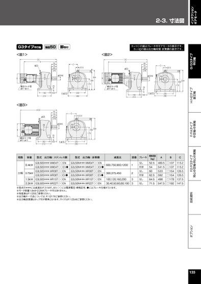 インダクションギアモータ2-3.寸法図オプション技術資料F2/F3タイプ同心中空軸・同心中実軸F/FAタイプ中空軸・中実軸H/H2タイプ直交軸G/G3タイプ平行軸G3タイプ平行軸軸径50脚取付カッコ()の値はブレーキ付ギアモータの表示です。カッコ[]の値は出力軸材質炭素鋼の表示です。<図2>29294265170B適合コード径φ8~φ12(A)Aφ20787563[70]11φ50h653.529C14294265170251004-φ18160210230290<図1>(A)Aφ20787563[70]2φ50h653.5C14B適合コード径φ8~φ12<図3>B適合コード径φ8~φ1225100787563[70]25100160210(A)Aφ20401602104-φ18230290C14φ50h653.5292652941704-φ18230290相数容量型式出力軸:ステンレス鋼型式出力軸:炭素鋼減速比図番ブレーキ0.4kW三相0.75kW1.5kW2.2kWG3L50S***-WM04T◇◇ENG3L50S***-WM04T◇◇EV◆G3L50S***-WR08T◇◇ENG3L50S***-WR08T◇◇EV◆G3L50S***-WR15T◇◇ENG3L50S***-WR22T◇◇ENG3L50N***-WM04T◇◇ENG3L50N***-WM04T◇◇EV◆G3L50N***-WR08T◇◇ENG3L50N***-WR08T◇◇EV◆G3L50N***-WR15T◇◇ENG3L50N***-WR22T◇◇EN600,750,900,1200300,375,450100,120,160,20030,40,50,60,80,1001233なし付きなし付きなしなし概略質量(kg)52.5546062.564.571.5ABC480.5541.5533592498547.5□137□137□154□154□178□192115.2115.2126.5126.5137.5147.5※型式の***には減速比が入ります。また◇◇には電源電圧・規格記号、◆にはブレーキ仕様が入ります。※モータ容量1.5kW・2.2kWブレーキ付はありません。※性能表はP.125をご参照ください。※出力軸キー寸法については、P.1217をご参照ください。※出力軸炭素鋼はタップ付が標準となります。サイズはP.1254をご参照ください。133