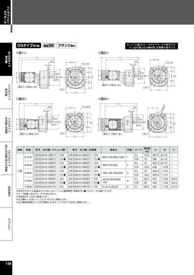 インダクションギアモータG/G3タイプ平行軸H/H2タイプ直交軸F/FAタイプ中空軸・中実軸F2/F3タイプ同心中空軸・同心中実軸技術資料オプションG3タイプ平行軸軸径32フランジ取付カッコ()の値はブレーキ付ギアモータの表示です。カッコ[]の値は出力軸材質炭素鋼の表示です。604151<図1>(A)AB適合コード径φ8~φ12<図3><図2>(A)A108.2P.C.D.2505545[50]φ180h7φ32h610107.5B23435126.5適合コード径φ8~φ124-φ13215<図4>604155.55545[50]φ180h7φ32h6108.210P.C.D.250107.523435126.54-φ13215(A)A6041528.55545[50]φ180h7φ32h6115.210.C.D.φ250P107.523435126.5BB(A)A6041528.55545[50]φ180h7φ32h6C10適合コード径φ8~φ124-φ13215適合コード径φ8~φ124-φ13215052φDCP107.523435126.5相数容量型式出力軸:ステンレス鋼型式出力軸:炭素鋼減速比図番ブレーキ三相0.1kW0.2kW0.4kW0.75kW1.5kWG3F32S***-WM01T◇◇ENG3F32S***-WM01T◇◇EV◆G3F32S***-WM02T◇◇ENG3F32S***-WM02T◇◇EV◆G3F32S***-WM04T◇◇ENG3F32S***-WM04T◇◇EV◆G3F32S***-WR08T◇◇ENG3F32S***-WR08T◇◇EV◆G3F32S***-WR15T◇◇ENG3F32N***-WM01T◇◇ENG3F32N***-WM01T◇◇EV◆G3F32N***-WM02T◇◇ENG3F32N***-WM02T◇◇EV◆G3F32N***-WM04T◇◇ENG3F32N***-WM04T◇◇EV◆G3F32N***-WR08T◇◇ENG3F32N***-WR08T◇◇EV◆G3F32N***-WR15T◇◇EN600,750,900,1200300,375,450100,120,160,20030,40,50,60,80,1005,10,15,20,2512344なし付きなし付きなし付きなし付きなし概略質量(kg)13.5151415.51516.522.52528.5ABC367.5395402.5459344.5405.5397456433φ115φ115φ115□126□137□137□154□154□178――――――126.5126.5137.5※型式の***には減速比が入ります。また◇◇には電源電圧・規格記号、◆にはブレーキ仕様が入ります。※モータ容量1.5kWブレーキ付はありません。※性能表はP.124をご参照ください。※出力軸キー寸法については、P.1217をご参照ください。※出力軸炭素鋼はタップ付が標準となります。サイズはP.1254をご参照ください。138