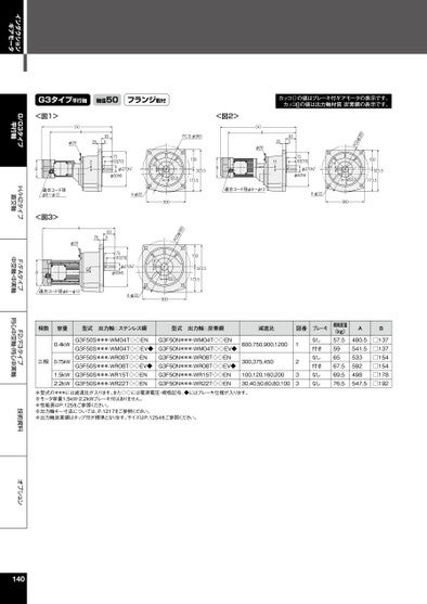 インダクションギアモータG/G3タイプ平行軸H/H2タイプ直交軸F/FAタイプ中空軸・中実軸F2/F3タイプ同心中空軸・同心中実軸技術資料オプションG3タイプ平行軸軸径50フランジ取付カッコ()の値はブレーキ付ギアモータの表示です。カッコ[]の値は出力軸材質炭素鋼の表示です。<図2>(A)Aφ208352511適合コード径φ8~φ12φ360DCP7563[70]φ270h7φ50h614150323.553.5173.54-φ22300.C.D.φ360P150323.5B53.5173.5300φ360DCP150323.553.5173.514144-φ227563[70]φ270h7φ50h6358252<図1>(A)Aφ20B適合コード径φ8~φ12<図3>4-φ223007563[70]φ270h7φ50h6Aφ208352540B適合コード径φ8~φ12相数容量型式出力軸:ステンレス鋼型式出力軸:炭素鋼減速比図番ブレーキ0.4kW三相0.75kW1.5kW2.2kWG3F50S***-WM04T◇◇ENG3F50S***-WM04T◇◇EV◆G3F50S***-WR08T◇◇ENG3F50S***-WR08T◇◇EV◆G3F50S***-WR15T◇◇ENG3F50S***-WR22T◇◇ENG3F50N***-WM04T◇◇ENG3F50N***-WM04T◇◇EV◆G3F50N***-WR08T◇◇ENG3F50N***-WR08T◇◇EV◆G3F50N***-WR15T◇◇ENG3F50N***-WR22T◇◇EN600,750,900,1200300,375,450100,120,160,20030,40,50,60,80,1001233なし付きなし付きなしなし概略質量(kg)57.5596567.569.576.5AB480.5541.5533592498547.5□137□137□154□154□178□192※型式の***には減速比が入ります。また◇◇には電源電圧・規格記号、◆にはブレーキ仕様が入ります。※モータ容量1.5kW・2.2kWブレーキ付はありません。※性能表はP.125をご参照ください。※出力軸キー寸法については、P.1217をご参照ください。※出力軸炭素鋼はタップ付が標準となります。サイズはP.1254をご参照ください。140