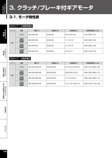 インダクションギアモータG/G3タイプ平行軸H/H2タイプ直交軸F/FAタイプ中空軸・中実軸F2/F3タイプ同心中空軸・同心中実軸技術資料オプション3.クラッチ/ブレーキ付ギアモータ3-1.モータ特性表G3タイプ三相標準電圧シリーズMID容量0.1kW0.2kW0.4kW0.75kW電圧(V)周波数(Hz)定格電流(A)定格回転速度(r/min)200/200/22050/60/600.61/0.54/0.541410/1690/1710200/200/22050/60/601.1/1.0/1.01400/1680/1700200/200/22050/60/602.1/1.8/1.81400/1680/1700200/200/22050/60/603.5/3.2/3.11450/1740/1750G3タイプ三相倍電圧シリーズMID容量0.1kW0.2kW0.4kW0.75kW電圧(V)周波数(Hz)定格電流(A)定格回転速度(r/min)380/400/400/44050/50/60/600.31/0.31/0.28/0.281400/1410/1690/1720380/400/400/44050/50/60/600.56/0.56/0.5/0.51390/1400/1680/1710380/400/400/44050/50/60/601.0/1.0/0.9/0.91390/1400/1680/1710380/400/400/44050/50/60/601.73/1.72/1.58/1.541440/1450/1740/1750146