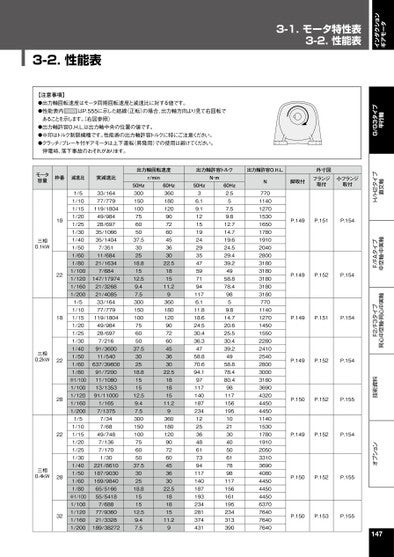 3-1.モータ特性表3-2.性能表インダクションギアモータオプション技術資料F2/F3タイプ同心中空軸・同心中実軸F/FAタイプ中空軸・中実軸H/H2タイプ直交軸G/G3タイプ平行軸3-2.性能表【注意事項】●出力軸回転速度はモータ同期回転速度と減速比に対する値です。●性能表内はP.555に示した結線(正転)の場合、出力軸方向より見て右回転であることを示します。右図参照)●出力軸許容O.H.L.は出力軸中央の位置の値です。●※印はトルク制限機種です。性能表の出力軸許容トルクに特にご注意ください。●クラッチ/ブレーキ付ギアモータは上下運転(昇降用)での使用は避けてください。停電時、落下事故のおそれがあります。モータ容量三相0.1kW182218三相0.2kW222822三相0.4kW2832枠番減速比実減速比r/min出力軸回転速度出力軸許容トルク出力軸許容O.H.L.1/51/101/151/201/251/301/401/501/601/801/1001/1201/1601/2001/51/101/151/201/251/301/401/501/601/80※1/1001/1001/1201/1601/2001/51/101/151/201/251/301/401/501/601/80※1/1001/1001/1201/1601/20033/16477/779119/180449/98428/69735/106635/14047/35111/68421/16347/684147/1797421/326821/408533/16477/779119/180449/98428/6977/21691/360011/540637/3960091/720011/108013/135391/110001/1657/13757/347/6849/7487/1367/1701/30221/8610187/9030169/984065/516655/54187/68877/936021/3328189/3827250Hz30015010075605037.5302518.81512.59.47.530015010075605037.5302518.8151512.59.47.530015010075605037.5302518.8151512.59.47.560Hz36018012090726045363022.5181511.2936018012090726045363022.518181511.2936018012090726045363022.518181511.29N・m50Hz60Hz36.19.1121519242935475971941176.111.818.624.530.436.34758.870.694.197117140187234122536486173941171401871932342813744312.557.59.812.714.719.624.529.439.24958.878.49859.814.720.625.530.439.24958.878.480.4981171561951021304050617898117156161195234313390N770114012701530165017801910204028003180318031803180318077011401270145015502280241025402800300031803690432044504450114015301780191020503310369040804450445044506370764076407640外寸図フランジ取付小フランジ取付脚取付P.149P.151P.154P.149P.152P.154P.149P.151P.154P.149P.152P.154P.150P.152P.155P.149P.152P.154P.150P.152P.155P.150P.153P.155147