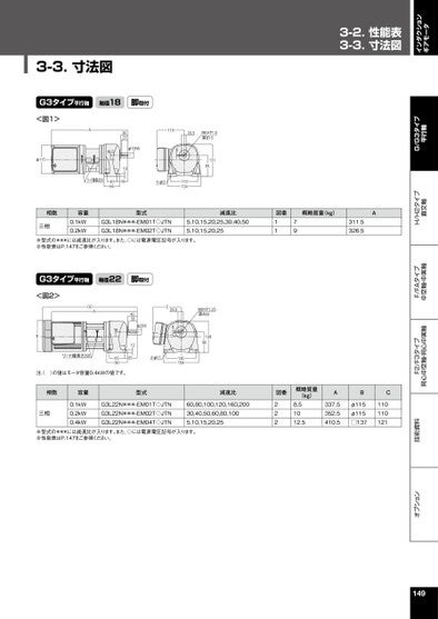 インダクションギアモータ3-2.性能表3-3.⼨法図オプション技術資料F2/F3タイプ同心中空軸・同心中実軸F/FAタイプ中空軸・中実軸H/H2タイプ直交軸G/G3タイプ平行軸3-3.⼨法図G3タイプ平行軸軸径18脚取付<図1>φ115A16.5リード線長さ2004064φ18h63027104520.5M6×P1.0深さ151106131854-φ9110134相数三相容量0.1kW0.2kW型式減速比G3L18N***-EM01T◇JTNG3L18N***-EM02T◇JTN5,10,15,20,25,30,40,505,10,15,20,25図番1179概略質量(kg)A311.5326.5※型式の***には減速比が入ります。また、◇には電源電圧記号が入ります。※性能表はP.147をご参照ください。G3タイプ平行軸軸径22脚取付<図2>B(A)Aリード線長さ2004035φ22h61255196590C24.56M8×P1.25深さ20139904-φ11130154注.()の値はモータ容量0.4kWの値です。相数容量型式減速比三相0.1kW0.2kW0.4kWG3L22N***-EM01T◇JTNG3L22N***-EM02T◇JTNG3L22N***-EM04T◇JTN60,80,100,120,160,20030,40,50,60,80,1005,10,15,20,25※型式の***には減速比が入ります。また、◇には電源電圧記号が入ります。※性能表はP.147をご参照ください。図番概略質量(kg)2228.51012.5A337.5352.5410.5BCφ115φ115□137110110121149