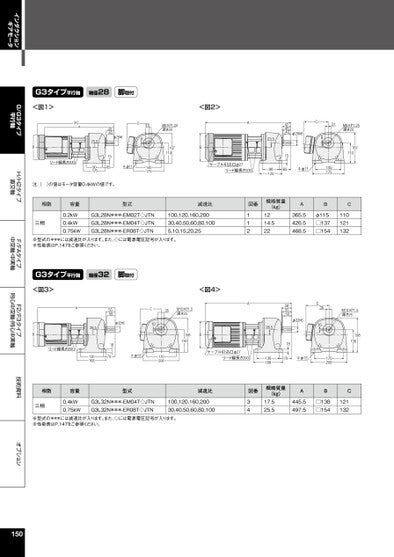インダクションギアモータG/G3タイプ平行軸H/H2タイプ直交軸F/FAタイプ中空軸・中実軸F2/F3タイプ同心中空軸・同心中実軸技術資料オプションG3タイプ平行軸軸径28脚取付<図1>(A)ABリード線長さ2004540φ28h623.5901251565注.)の値はモータ容量0.4kWの値です。<図2>AC318M8×P1.25深さ20167110B4-φ11140175ケーブル引込口φ27リード線長さ200474540φ28h6C831M8×P1.25深さ2016711015654-φ1114017523.590125図番概略質量(kg)1214.522A365.5426.5468.5BCφ115□137□154110121132相数容量型式減速比三相0.2kW0.4kW0.75kWG3L28N***-EM02T◇JTNG3L28N***-EM04T◇JTNG3L28N***-ER08T◇JTN100,120,160,20030,40,50,60,80,1005,10,15,20,25※型式の***には減速比が入ります。また、◇には電源電圧記号が入ります。※性能表はP.147をご参照ください。G3タイプ平行軸軸径32脚取付<図3><図4>112AAφ32h65550187028.5130168Bリード線長さ20035M10×P1.5深さ25C10B1981304-φ13170208ケーブル引込口φ27リード線長さ200C3510φ32h658555018704-φ1317020828.5130168M10×P1.5深さ25198130相数容量型式減速比三相0.4kW0.75kWG3L32N***-EM04T◇JTNG3L32N***-ER08T◇JTN100,120,160,20030,40,50,60,80,100※型式の***には減速比が入ります。また、◇には電源電圧記号が入ります。※性能表はP.147をご参照ください。図番概略質量(kg)3417.525.5A445.5497.5B□138□154C121132150