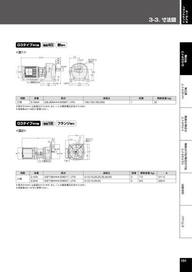 インダクションギアモータ3-3.⼨法図オプション技術資料F2/F3タイプ同心中空軸・同心中実軸F/FAタイプ中空軸・中実軸H/H2タイプ直交軸G/G3タイプ平行軸G3タイプ平行軸軸径40脚取付<図1>□154519.5ケーブル引込口φ27リード線長さ20068656020903415019613212φ40h643M10×P1.5深さ252301504-φ15210254相数三相容量0.75kW型式減速比図番概略質量(kg)G3L40N***-ER08T◇JTN100,120,160,200132※型式の***には減速比が入ります。また、◇には電源電圧記号が入ります。※性能表はP.148をご参照ください。M6×P1.0深さ157715780170.154.DC.P20.5G3タイプ平行軸軸径18フランジ取付<図2>φ115A35330271016.5φ18h6φ145h71106リード線長さ2004-φ11相数三相容量0.1kW0.2kW型式減速比G3F18N***-EM01T◇JTNG3F18N***-EM02T◇JTN5,10,15,20,25,30,40,505,10,15,20,25図番22概略質量(kg)A7.59.5311.5326.5※型式の***には減速比が入ります。また、◇には電源電圧記号が入ります。※性能表はP.147をご参照ください。151