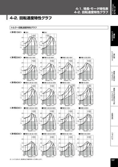 インダクションギアモータ4-1.特長・モータ特性表4-2.回転速度特性グラフオプション技術資料F2/F3タイプ同心中空軸・同心中実軸F/FAタイプ中空軸・中実軸H/H2タイプ直交軸G/G3タイプ平行軸4-2.回転速度特性グラフトルク一回転速度特性グラフ<単相15W>単相15W■100V200150ト■200V50Hz60Hz50Hz60Hz200150トル100ク〔%〕50050ル100ク〔%〕5005050010001500回転速度〔r/min〕50010001500回転速度〔r/min〕<単相25W>■枠番12・22/100V■枠番12・22/200V■枠番15・28/100V■枠番15・28/200V200150ト50Hz60Hz200150ト50Hz60Hz200150ト50Hz60Hz200150ト50Hz60Hzル100ク〔%〕50050ル100クル100クル100ク〔%〕50050〔%〕50050500回転速度〔r/min〕10001500500回転速度〔r/min〕10001500〔%〕50050500回転速度〔r/min〕10001500500回転速度〔r/min〕10001500■枠番15・28・32/100V■枠番15・28・32/200V■枠番18/100V■枠番18/200V<単相40W>200150ト50Hz60Hz200150ト50Hz60Hz200150ト50Hz60Hz50Hz60Hz200150トル100ク〔%〕50050ル100ク〔%〕50050ル100ク〔%〕5005050010001500回転速度〔r/min〕50010001500回転速度〔r/min〕ル100ク〔%〕5005050010001500回転速度〔r/min〕50010001500回転速度〔r/min〕<単相60W>■枠番15・28・32/100V■枠番15・28・32/200V■枠番18/100V■枠番18/200V200150ト50Hz60Hz200150ト50Hz60Hz200150ト50Hz60Hz200150ト50Hz60Hzル100ク〔%〕50050ル100ク〔%〕5005050010001500回転速度〔r/min〕ル100ク〔%〕5005050010001500回転速度〔r/min〕ル100ク〔%〕5005050010001500回転速度〔r/min〕50010001500回転速度〔r/min〕<単相90W>■枠番15・28・32/100V■枠番15・28・32/200V■枠番18・40/100V■枠番18・40/200V200150ト50Hz60Hz200150ト50Hz60Hz200150ト50Hz60Hz200150ト50Hz60Hzル100ク〔%〕50050ル100ク〔%〕50050ル100ク〔%〕5005050010001500回転速度〔r/min〕ル100ク〔%〕5005050010001500回転速度〔r/min〕50010001500回転速度〔r/min〕50010001500回転速度〔r/min〕注.トルク100%が、高速時出力軸許容トルクを表わします。157