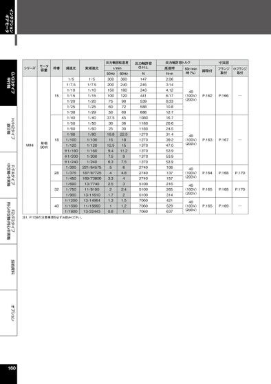 インダクションギアモータG/G3タイプ平行軸H/H2タイプ直交軸F/FAタイプ中空軸・中実軸F2/F3タイプ同心中空軸・同心中実軸技術資料オプション出力軸許容トルク高速時50r/min時(%)N・m2.063.144.126.178.3310.812.716.720.624.531.439.247.053.953.953.9108137157216265314421529637寸法図フランジ取付小フランジ取付脚取付40(100V)(200V)P.162P.166─40(100V)(200V)40(100V)(200V)40(100V)(200V)40(100V)(200V)P.163P.167─P.164P.168P.170P.165P.168P.170P.165P.169─シリーズモータ容量MINI単相90W枠番減速比実減速比r/min出力軸回転速度出力軸許容O.H.L.1/51/7.51/101/151/201/251/301/401/501/601/801/1001/120※1/160※1/200※1/2401/3001/3751/4501/6001/7501/9001/12001/15001/18001/51/7.51/101/151/201/251/291/401/501/601/801/1001/1201/1601/2001/240221/64575187/67725169/7380013/774011/810013/1161013/1496411/1566013/22443151828324050Hz30020015010075605037.5302518.81512.59.47.56.3543.32.521.71.310.860Hz36024018012090726045363022.5181511.297.564.8432.421.51.21N147245343441539588686108011801180127012701370137013701370274027402740510051005100706070607060注1.P.158の注意事項を必ずお読みください。160