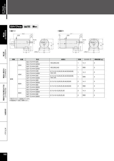インダクションギアモータG/G3タイプ平行軸H/H2タイプ直交軸F/FAタイプ中空軸・中実軸F2/F3タイプ同心中空軸・同心中実軸技術資料オプションGタイプ平行軸軸径15脚取付<図1>183.5300ℓφ40902724841134056φ15h6517901044-φ6.5217300ℓ<図2>49297652724841134056φ15h6517901044-φ6.59865相数容量型式減速比図番コントローラ概略質量(kg)単相25W40W60W90WGLU-15-***-S25GLU-15-***-S25WGLP-15-***-S25GLP-15-***-S25WGLU-15-***-S40GLU-15-***-S40WGLP-15-***-S40GLP-15-***-S40WGLU-15-***-S60GLU-15-***-S60WGLP-15-***-S60GLP-15-***-S60WGLU-15-***-S90GLU-15-***-S90WGLP-15-***-S90GLP-15-***-S90W※型式の***には減速比が入ります。※性能表はP.158をご参照ください。160,200,240160,200,2405,7.5,10,15,20,25,30,40,50,60,80,100,1205,7.5,10,15,20,25,30,40,50,60,80,100,1205,7.5,10,15,20,25,30,40,50,605,7.5,10,15,20,25,30,40,50,605,7.5,10,15,20,25,305,7.5,10,15,20,25,3011112222セット別売セット別売セット別売セット別売33333333162