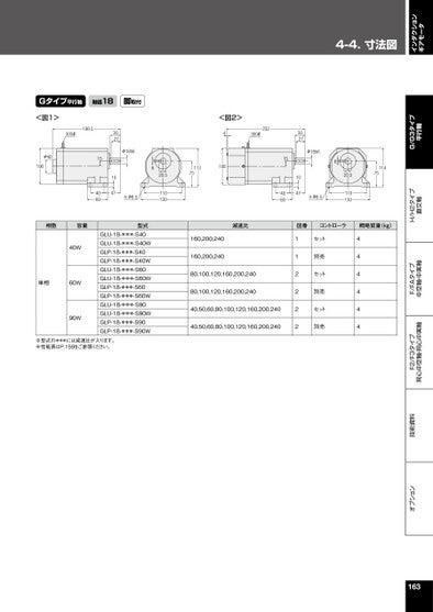 インダクションギアモータ4-4.寸法図オプション技術資料F2/F3タイプ同心中空軸・同心中実軸F/FAタイプ中空軸・中実軸H/H2タイプ直交軸G/G3タイプ平行軸Gタイプ平行軸軸径18脚取付198.5300ℓ<図1>φ4010630271047φ18h64-φ8.515406011375620.5110130232300ℓ<図2>410830271047154060φ18h6620.51101304-φ8.511475相数容量型式減速比図番コントローラ概略質量(kg)40W単相60W90WGLU-18-***-S40GLU-18-***-S40WGLP-18-***-S40GLP-18-***-S40WGLU-18-***-S60GLU-18-***-S60WGLP-18-***-S60GLP-18-***-S60WGLU-18-***-S90GLU-18-***-S90WGLP-18-***-S90GLP-18-***-S90W※型式の***には減速比が入ります。※性能表はP.159をご参照ください。160,200,240160,200,24080,100,120,160,200,24080,100,120,160,200,24040,50,60,80,100,120,160,200,24040,50,60,80,100,120,160,200,240112222セット別売セット別売セット別売444444163